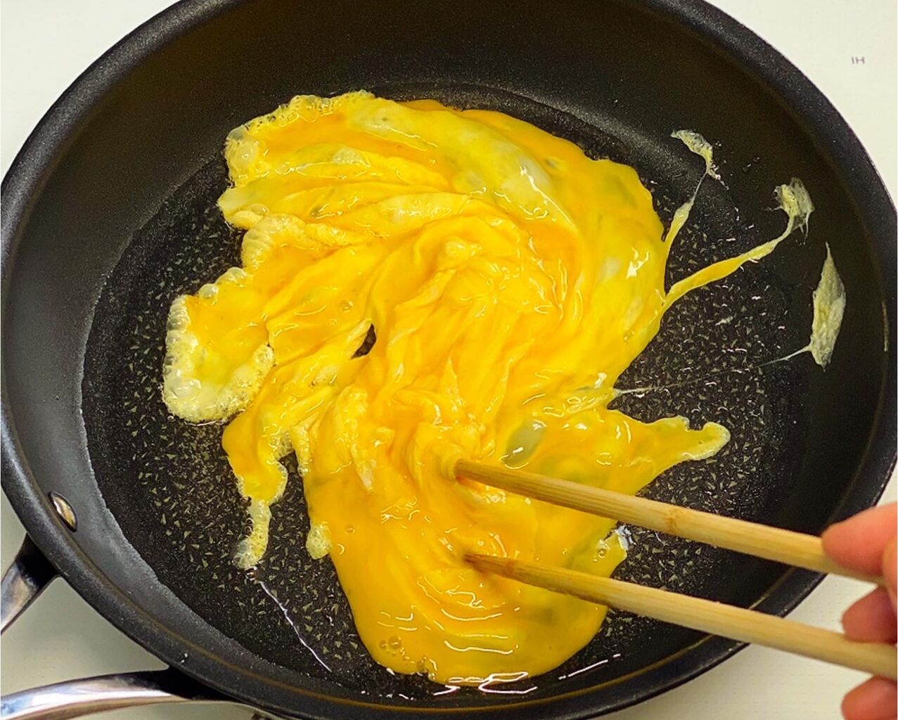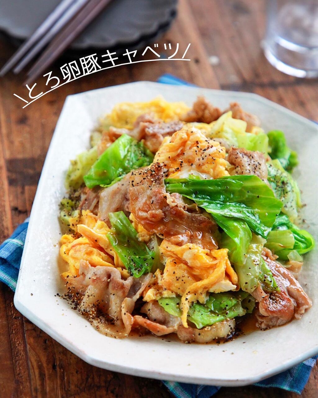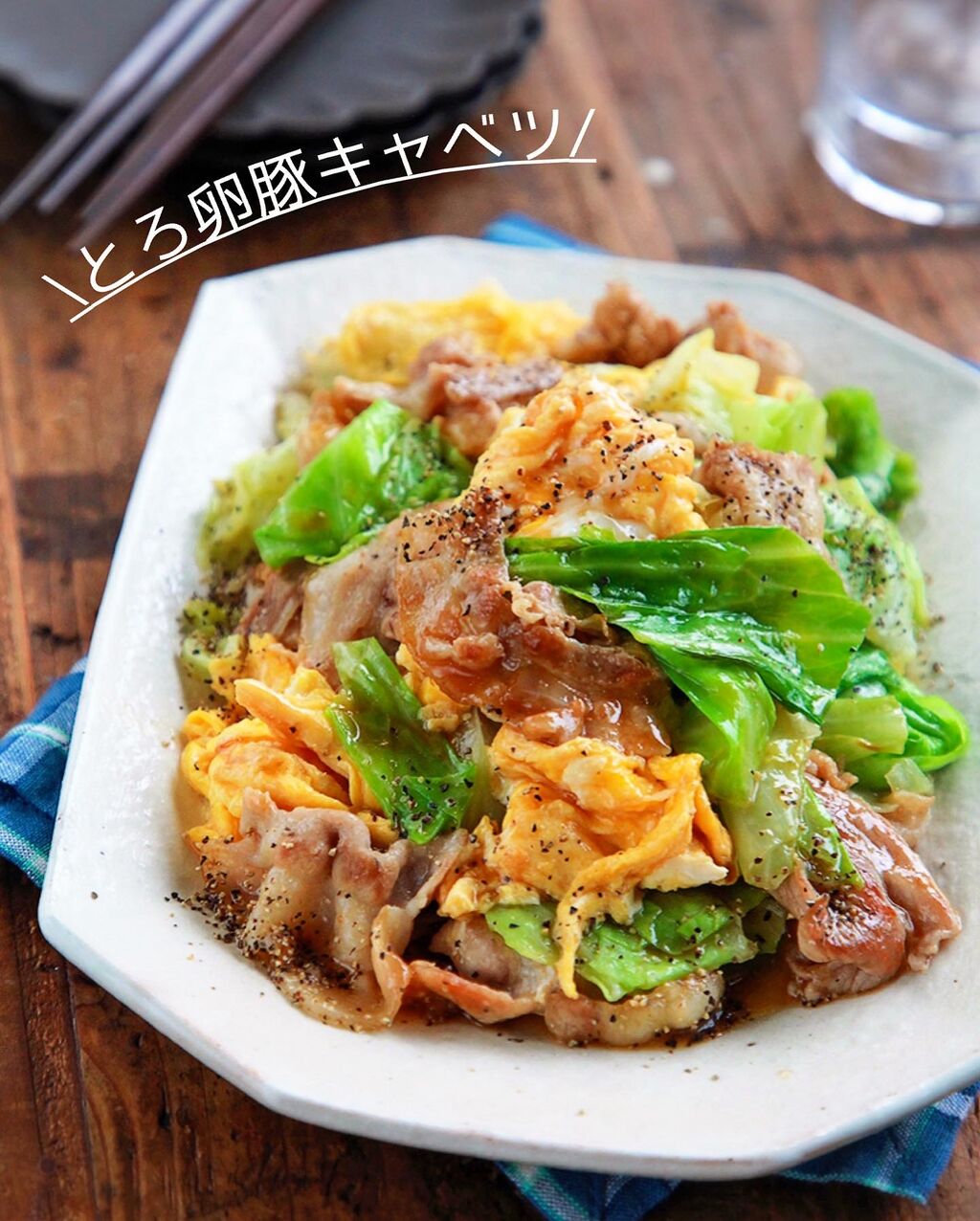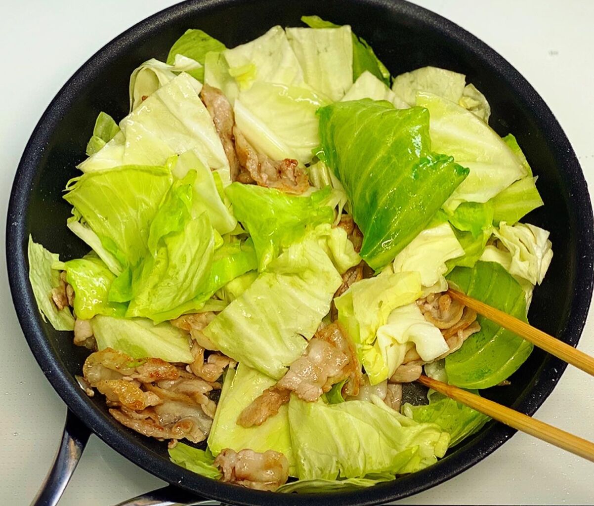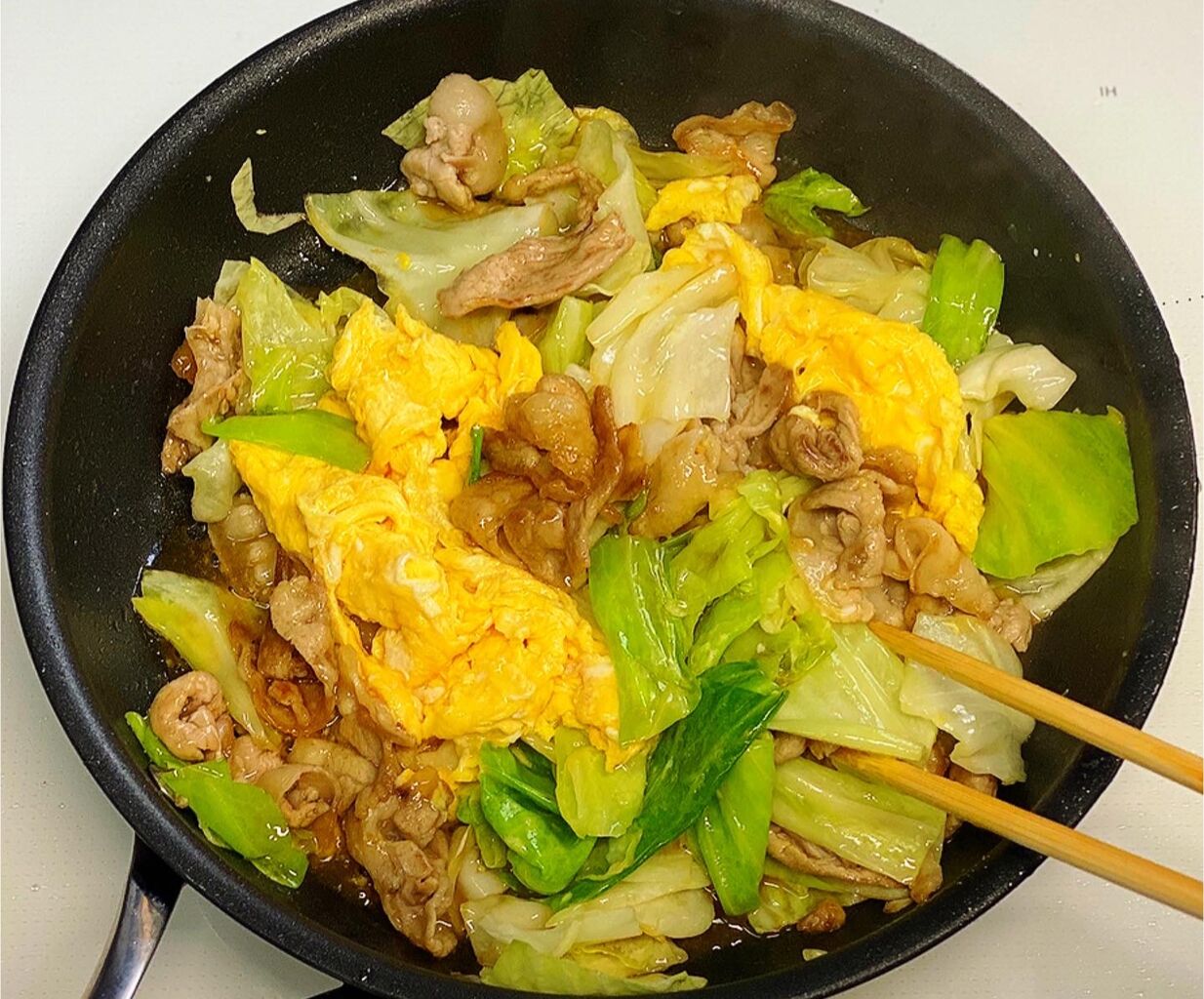 1.豚肉は5cm長さに切り、塩こしょうと片栗粉を揉み込む。キャベツはざく切りにする。卵は溶きほぐす。