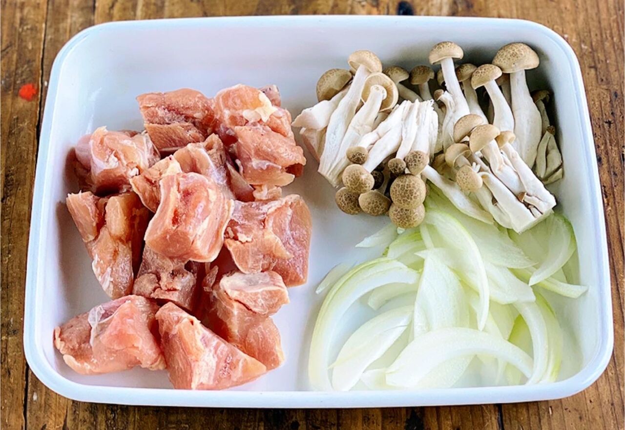 1.鶏肉は3cm大に切って塩こしょうを振る。玉ねぎは薄切りにする。しめじはほぐす。