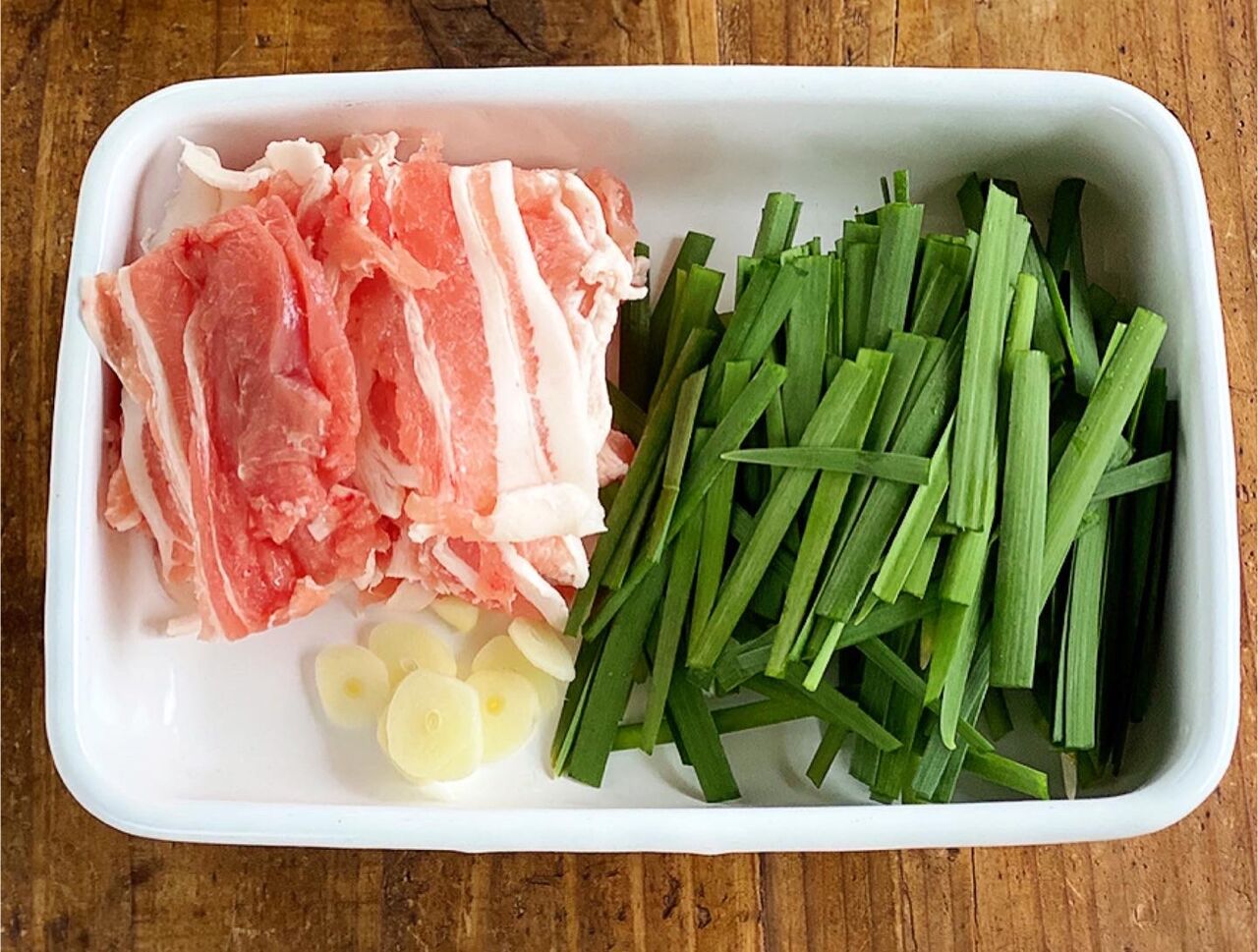 1.焼きそばは袋に一ヶ所穴を空け、600Wのレンジで2分加熱する。豚肉とニラは4cm長さに切る。にんにくは薄切りにする。