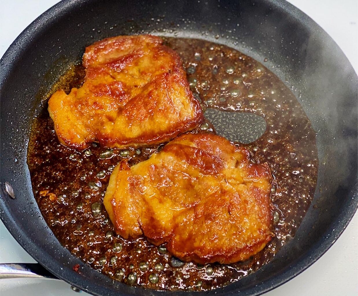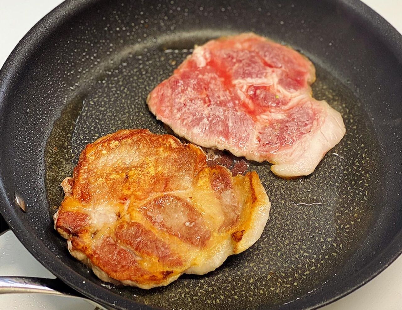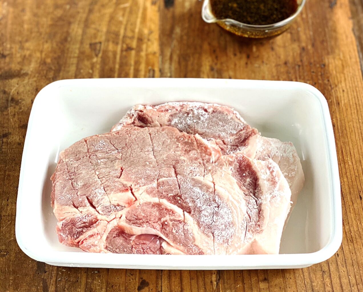 1.豚肉は筋を切って軽くたたき、塩こしょうを振って薄力粉をまぶす。●は合わせておく。