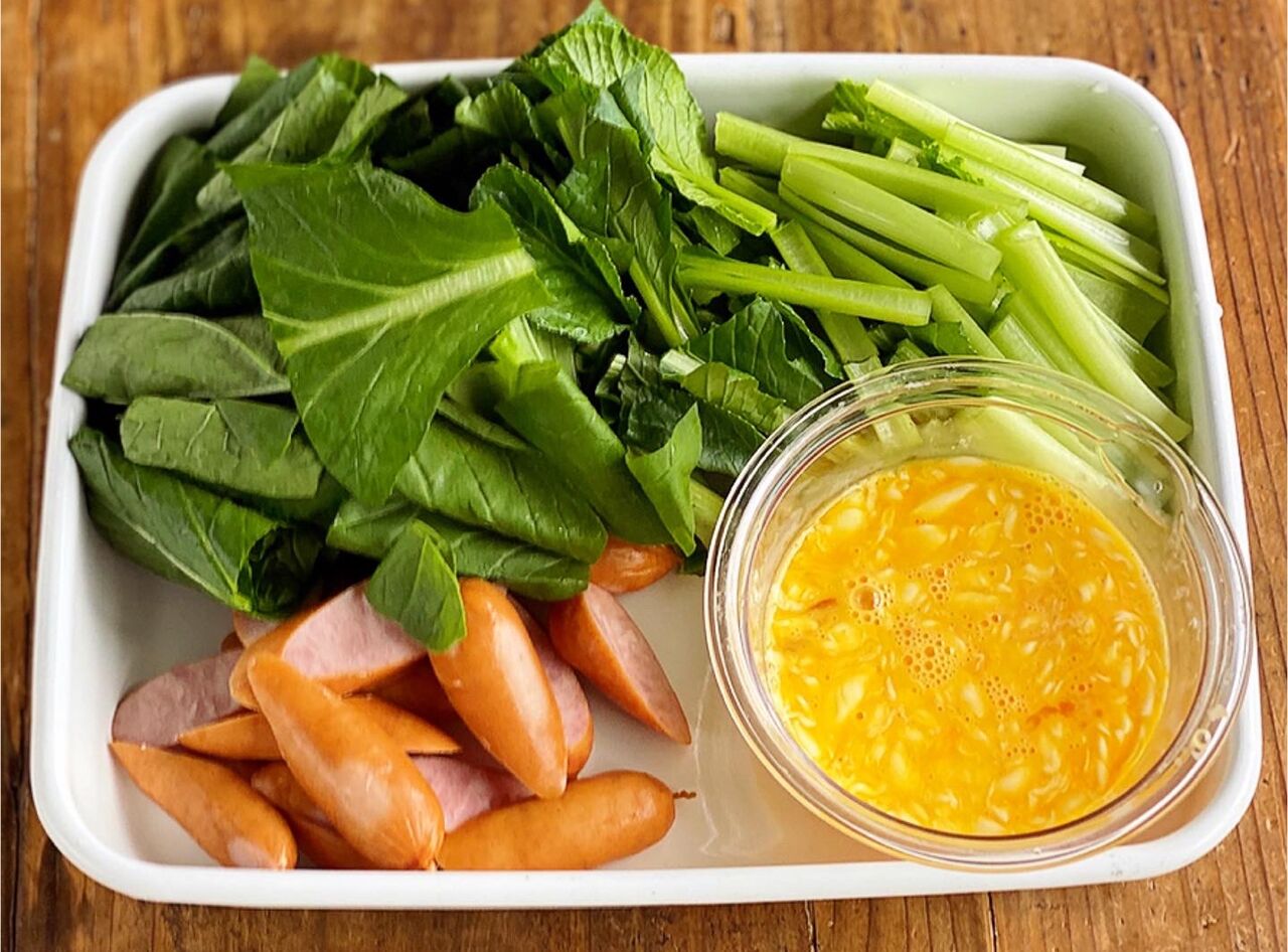 1.ウインナーは斜め3等分に切る。小松菜は4cm長さに切る。卵はマヨネーズを加えて溶きほぐす。