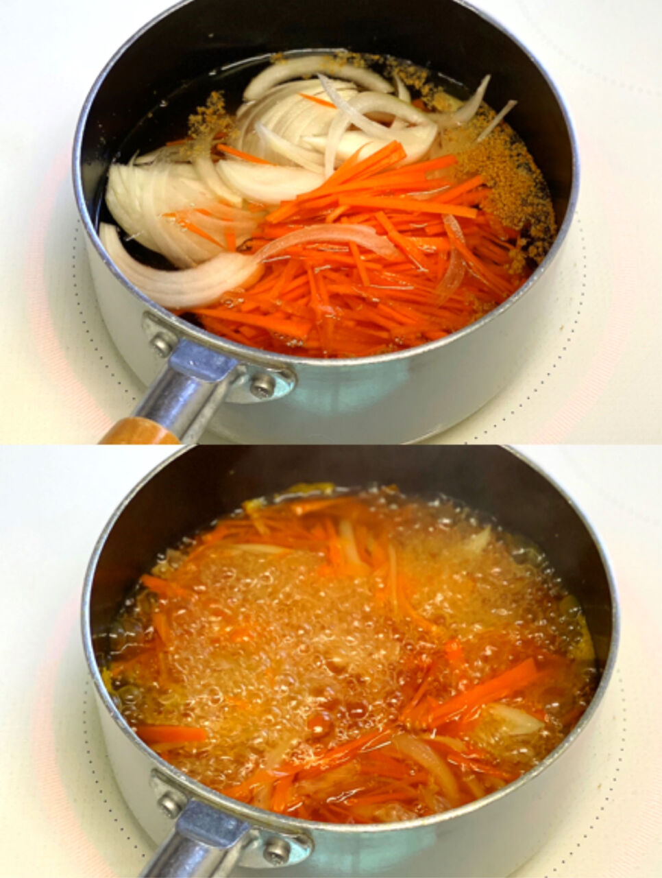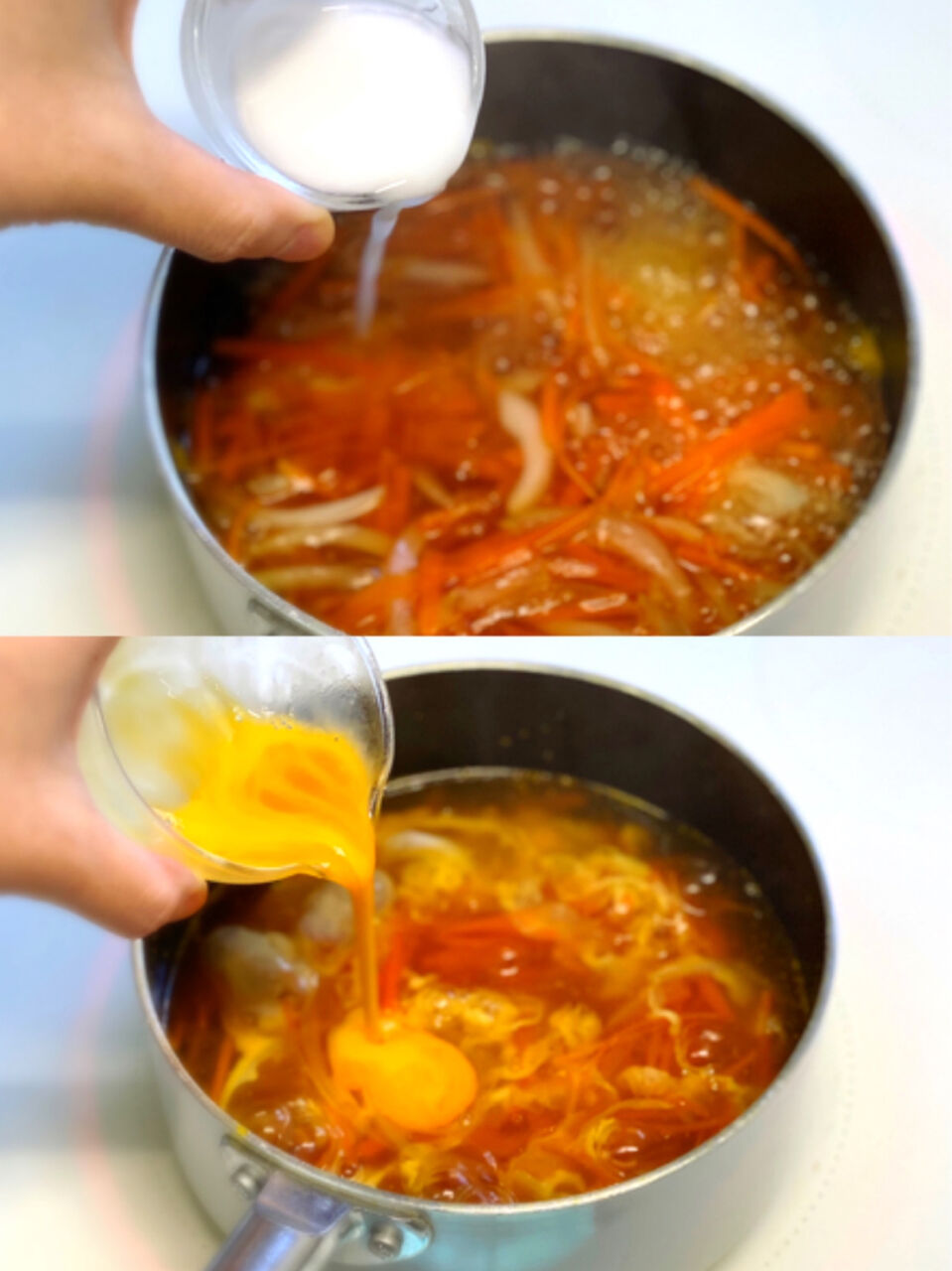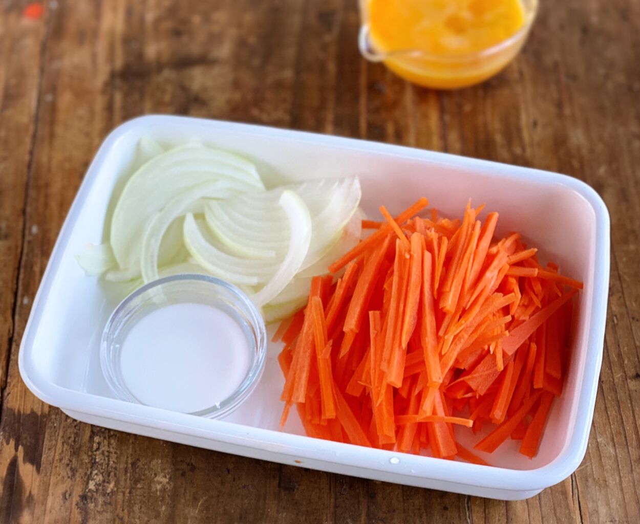 1.人参は千切りにする。玉ねぎは薄切りにする。卵は溶きほぐす。片栗粉は水大1(分量外)で溶いて水溶き片栗粉を作る。