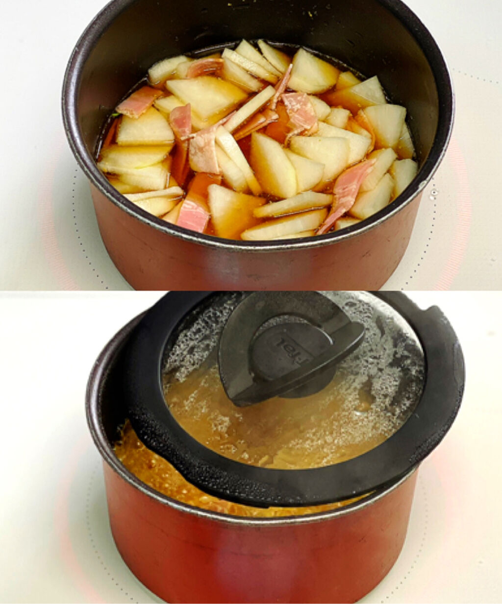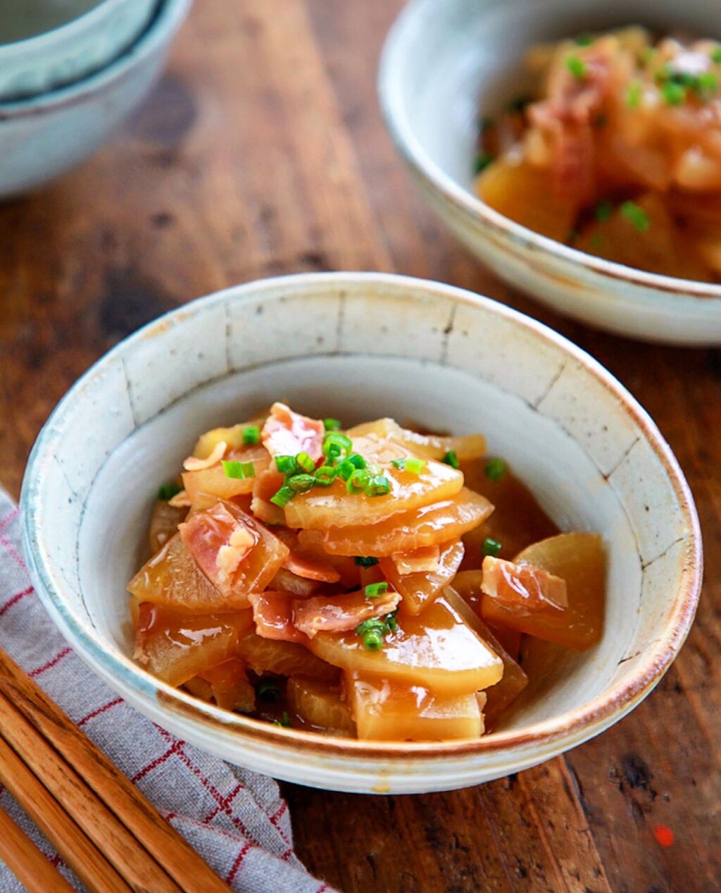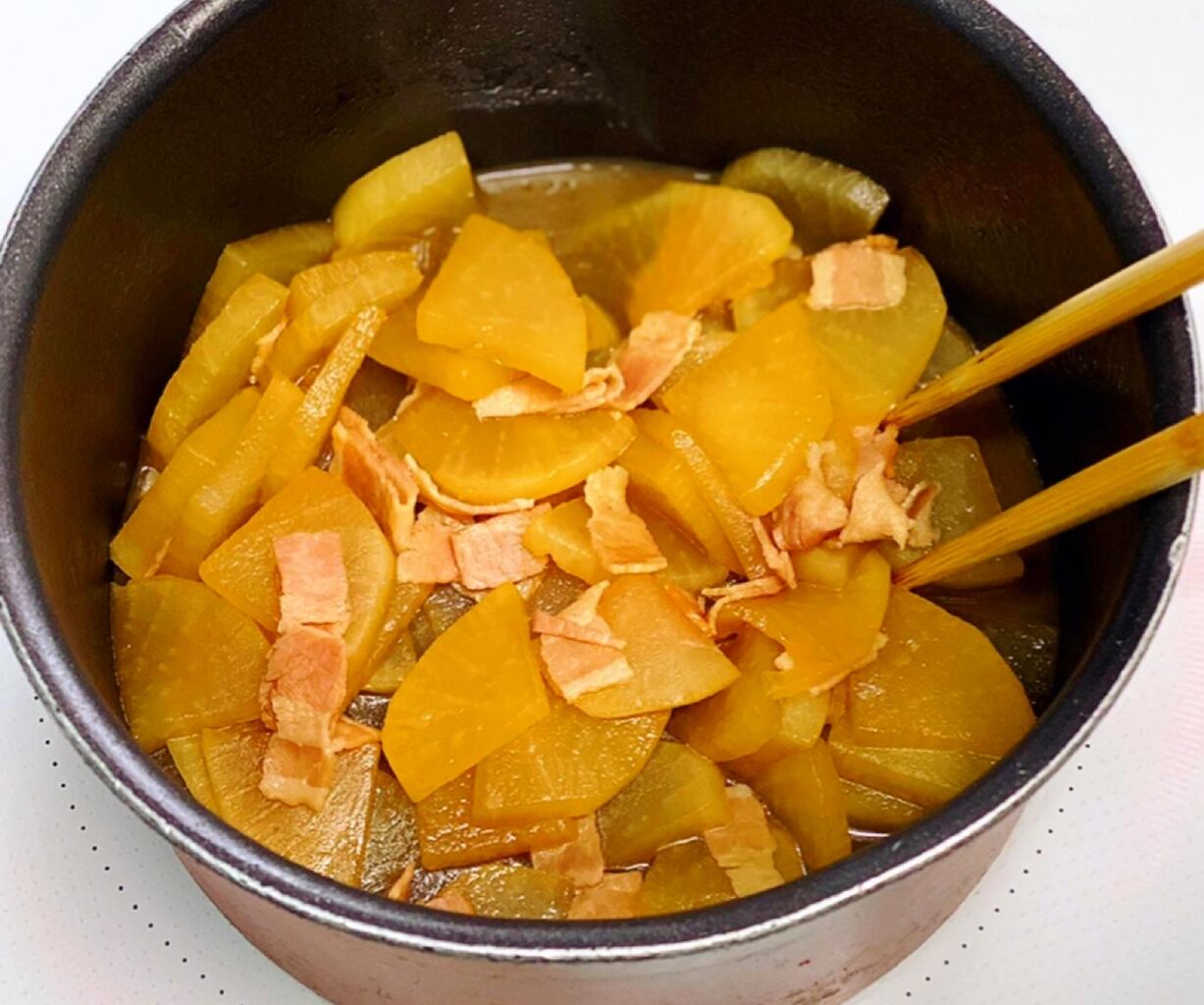 1.大根は皮を剥いて5mm厚さの半月切りにする。ベーコンは1cm幅に切る。