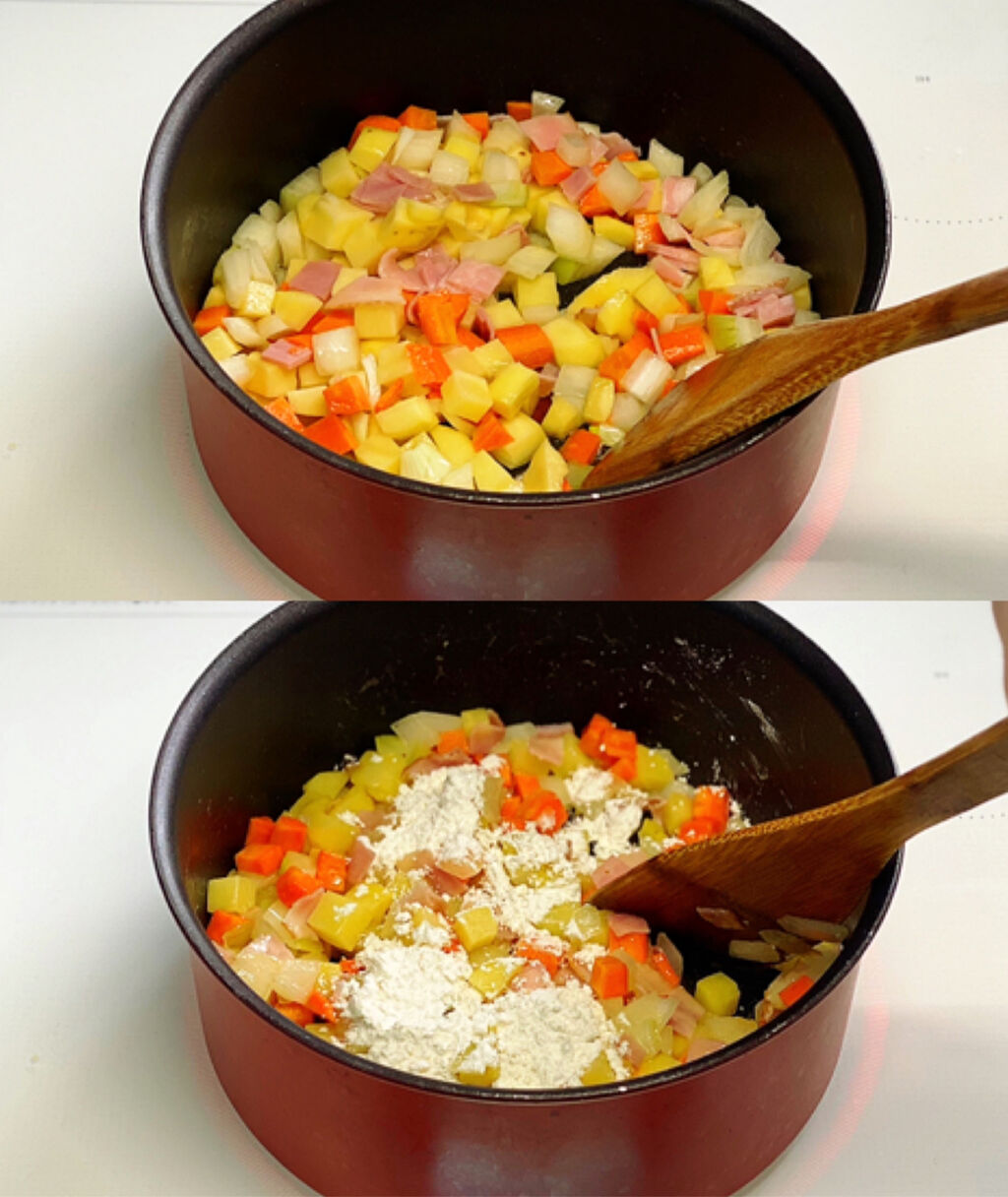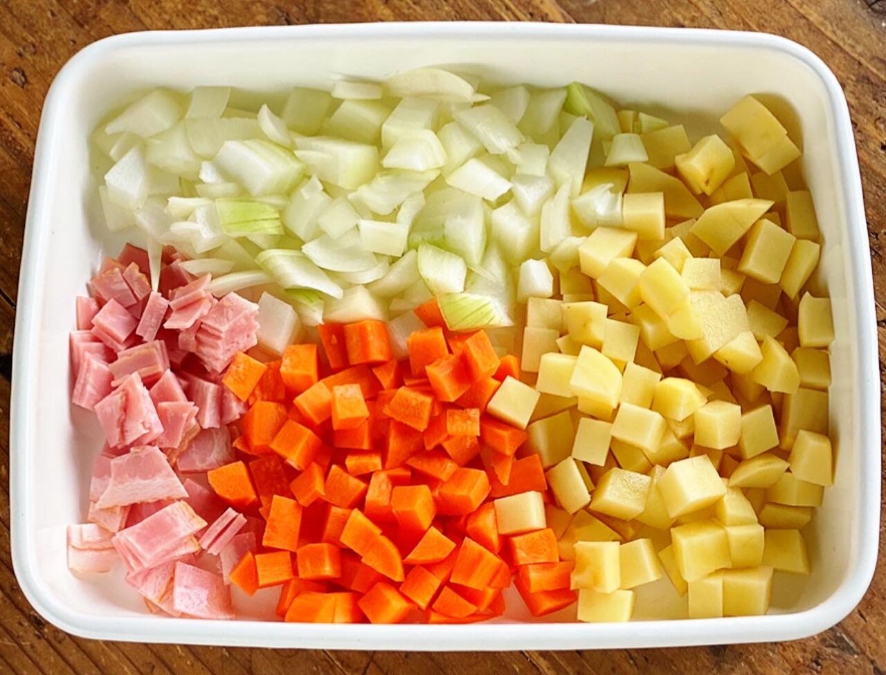 1.ベーコン、じゃがいも、玉ねぎは1cm角に、人参は5mm角に切る。