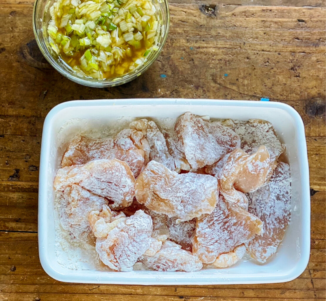 1.●を混ぜ合わせてねぎ塩だれを作る。鶏肉は全体をフォークで刺して1cm厚さの削ぎ切りにし、塩こしょうを振って薄力粉をまぶす。