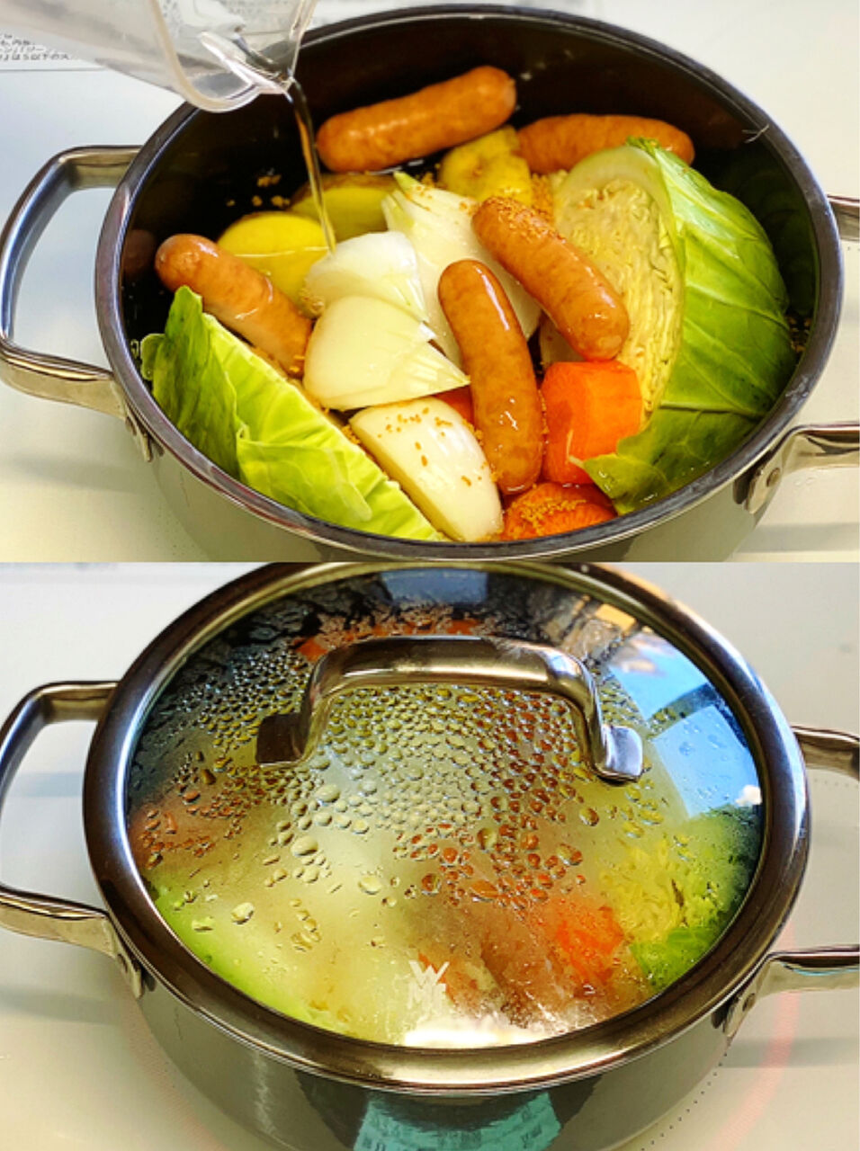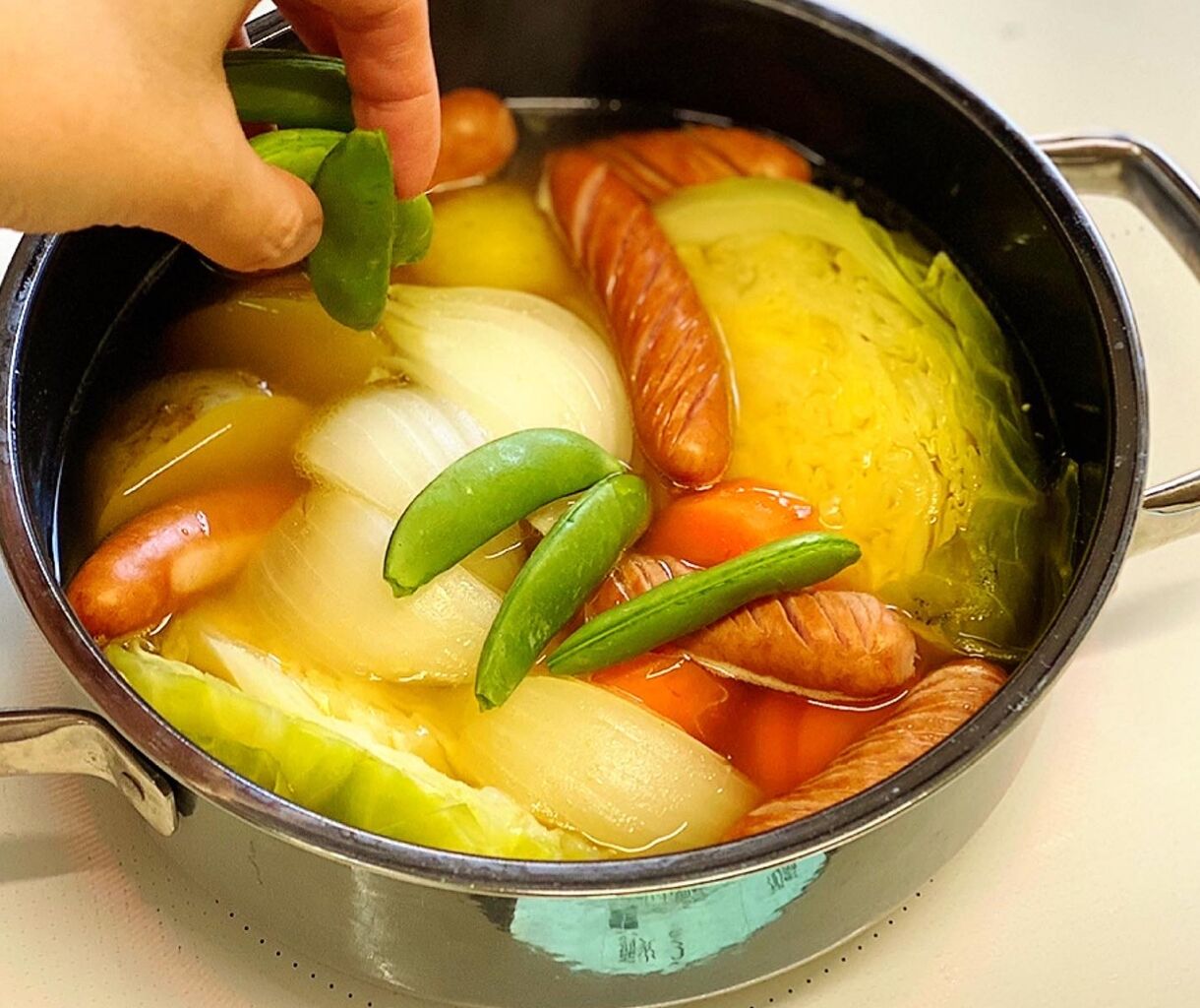 1.ウインナーは切り込みを入れる。じゃがいもは皮ごと4cm大に切る。玉ねぎは4等分のくし形に切る。人参は一口大に切り、キャベツは芯を残したまま縦半分に切る。スナップエンドウは筋を取る。
