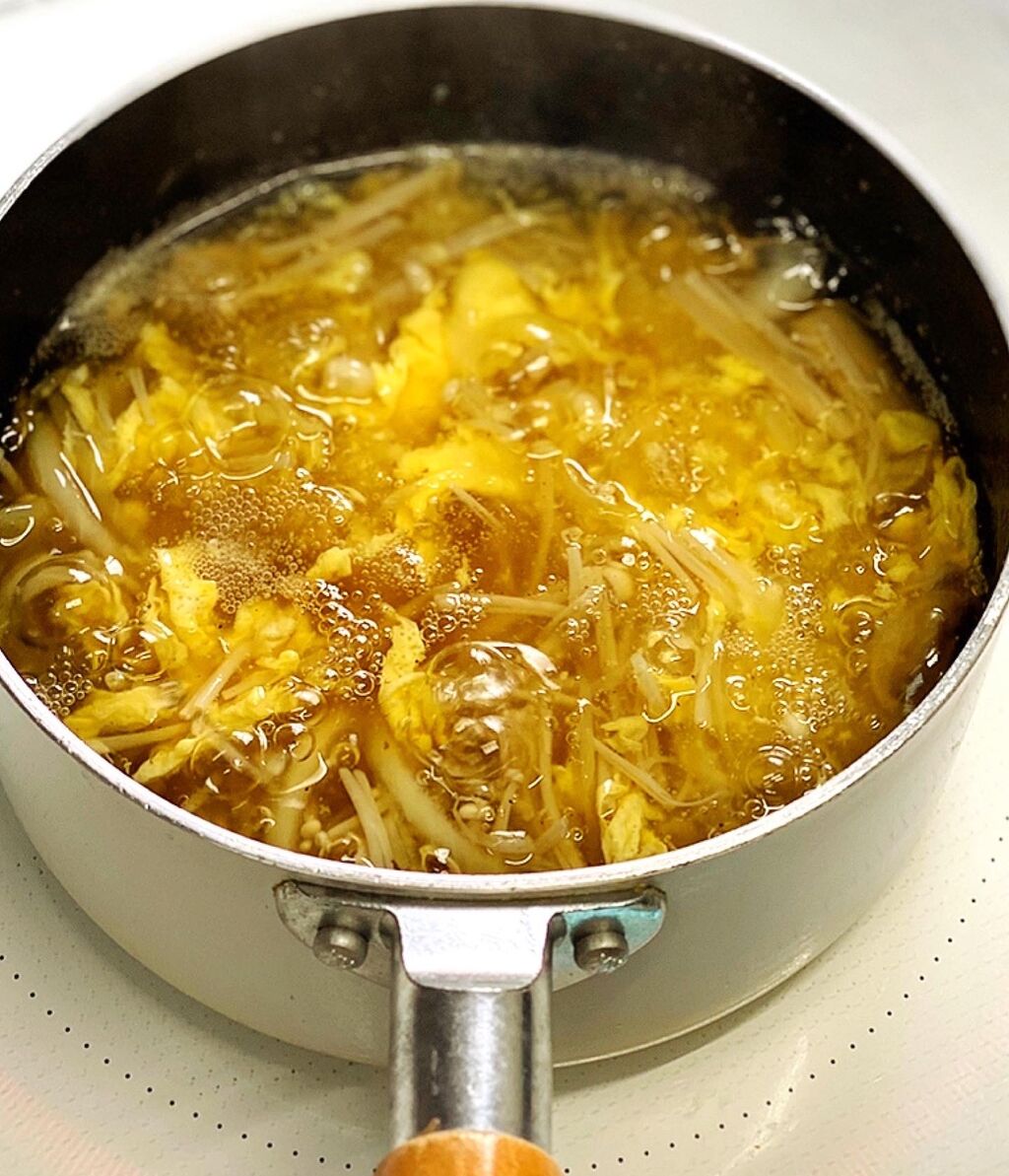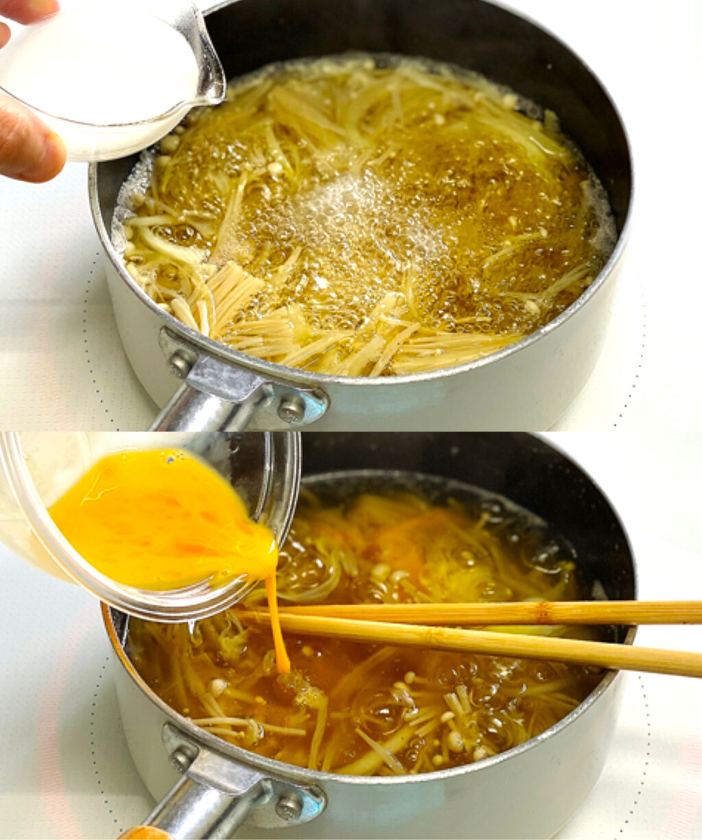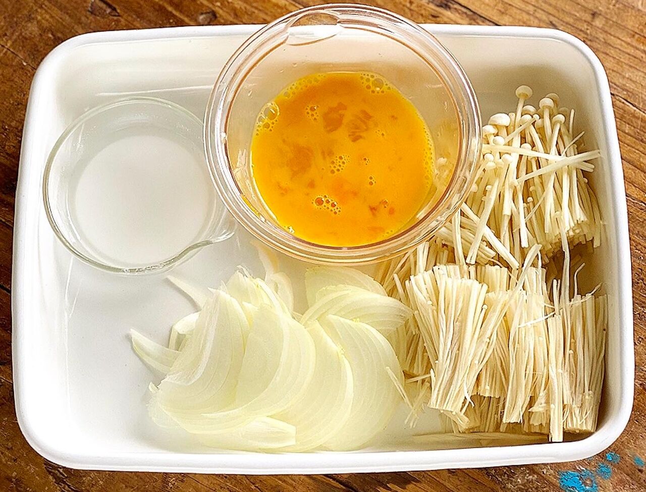 1.えのきは根元を切り落とし、長さを半分に切る。玉ねぎは薄切りにする。卵は溶きほぐす。片栗粉は水大1(分量外)で溶いて水溶き片栗粉を作る。