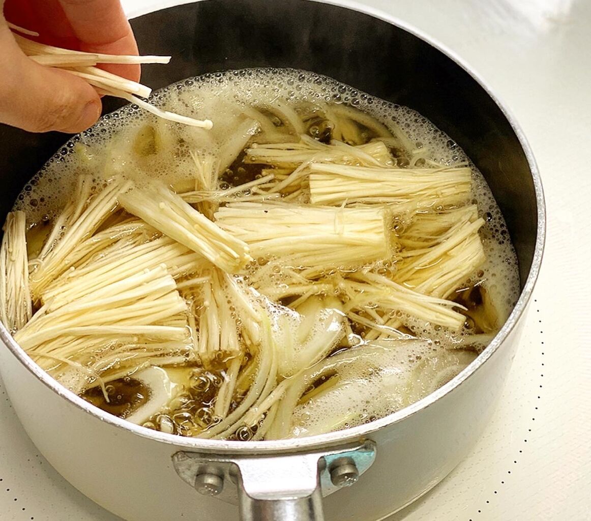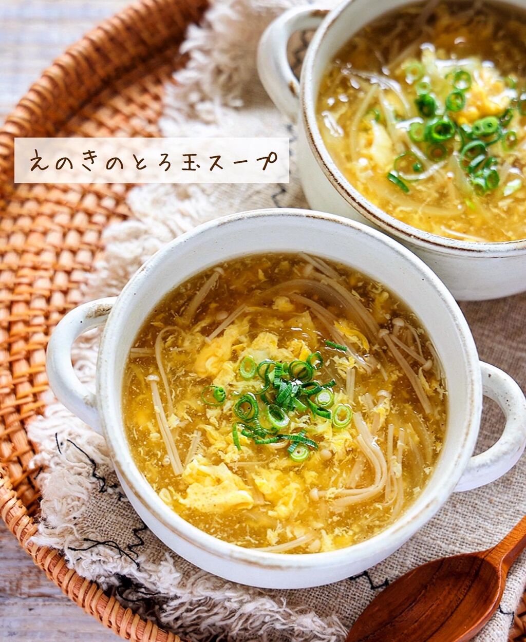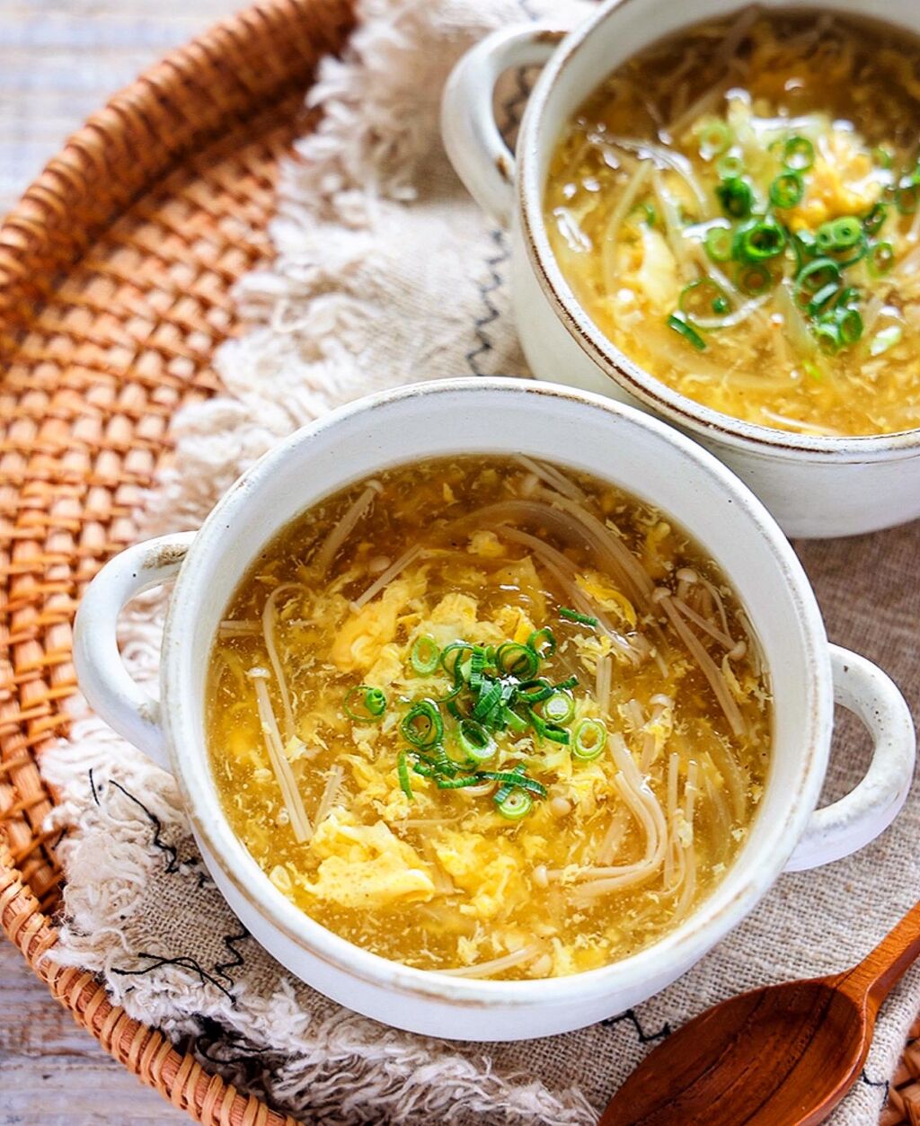 1.えのきは根元を切り落とし、長さを半分に切る。玉ねぎは薄切りにする。卵は溶きほぐす。片栗粉は水大1(分量外)で溶いて水溶き片栗粉を作る。