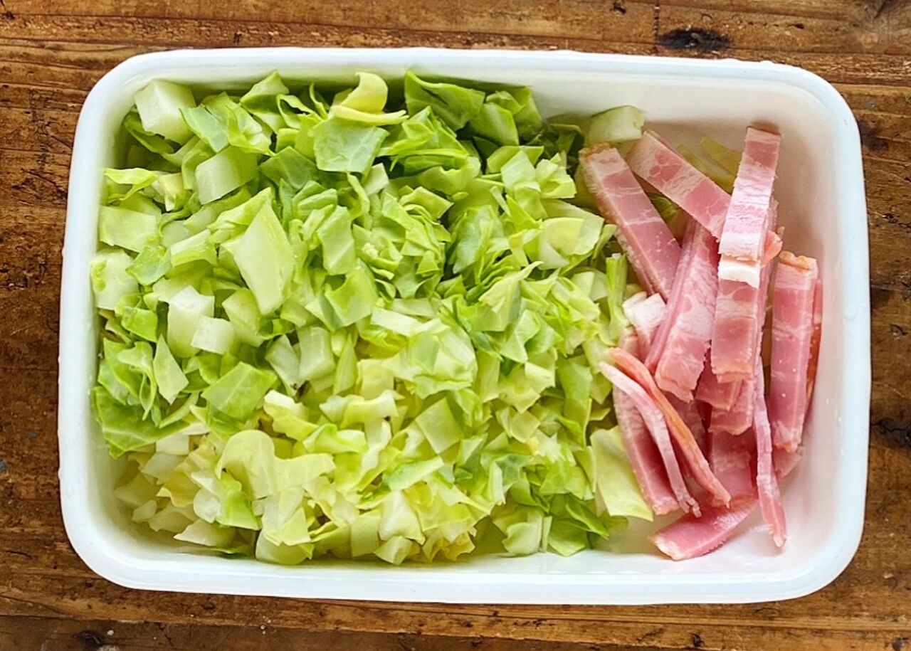 1.キャベツは粗みじん切りにする。ベーコンは1cm幅に切る。