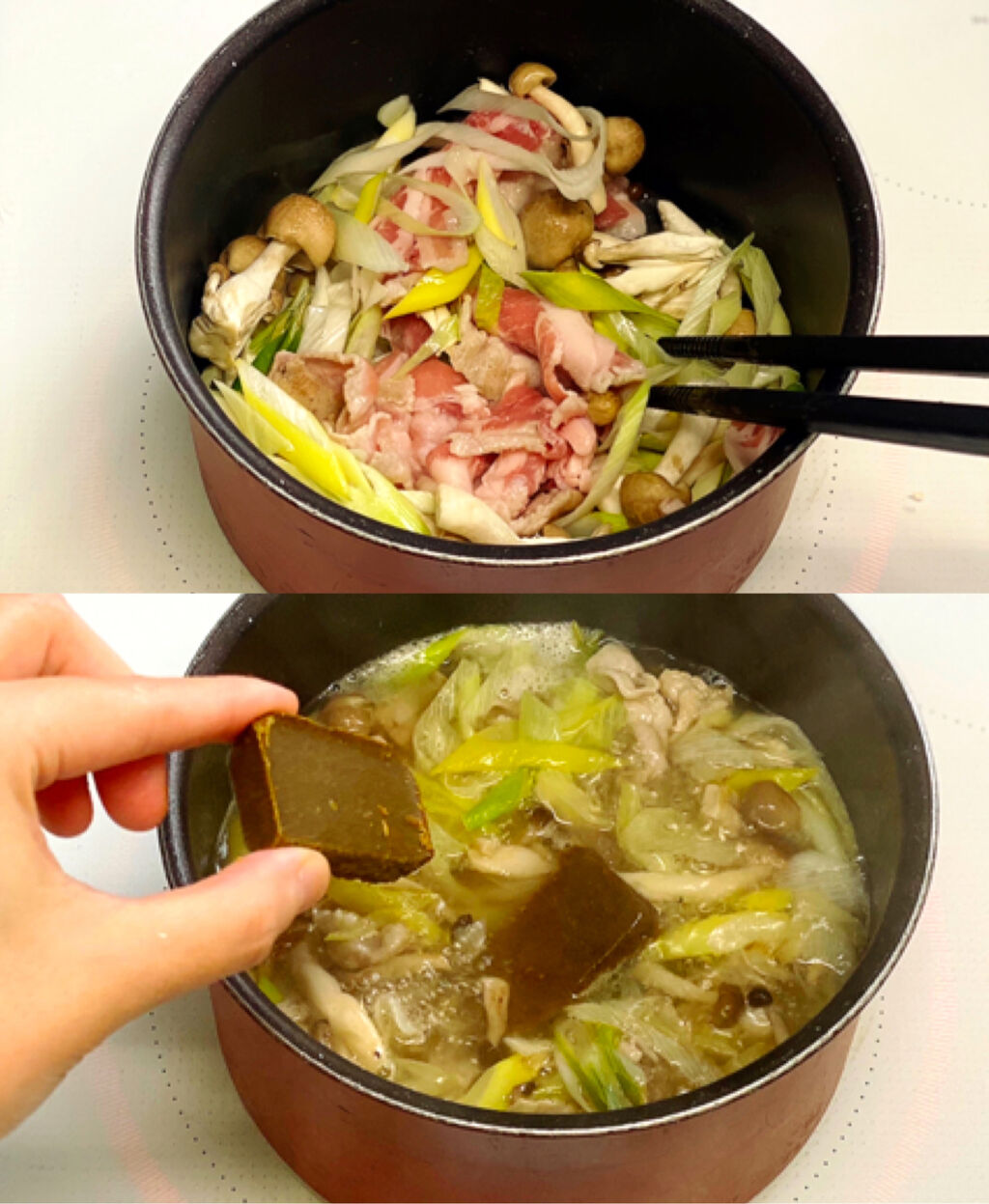 1.豚肉は3cm長さに切る。長ねぎは斜め薄切りにする。しめじはほぐす。麺は表示通り茹で、冷水で冷やして水気を切る。