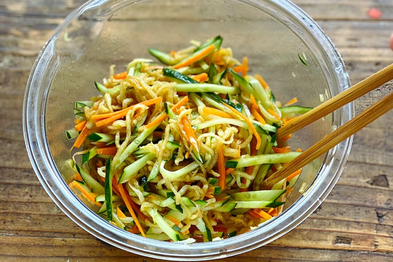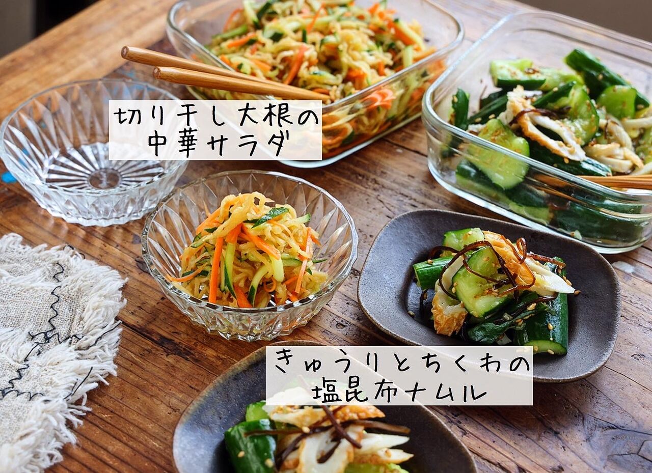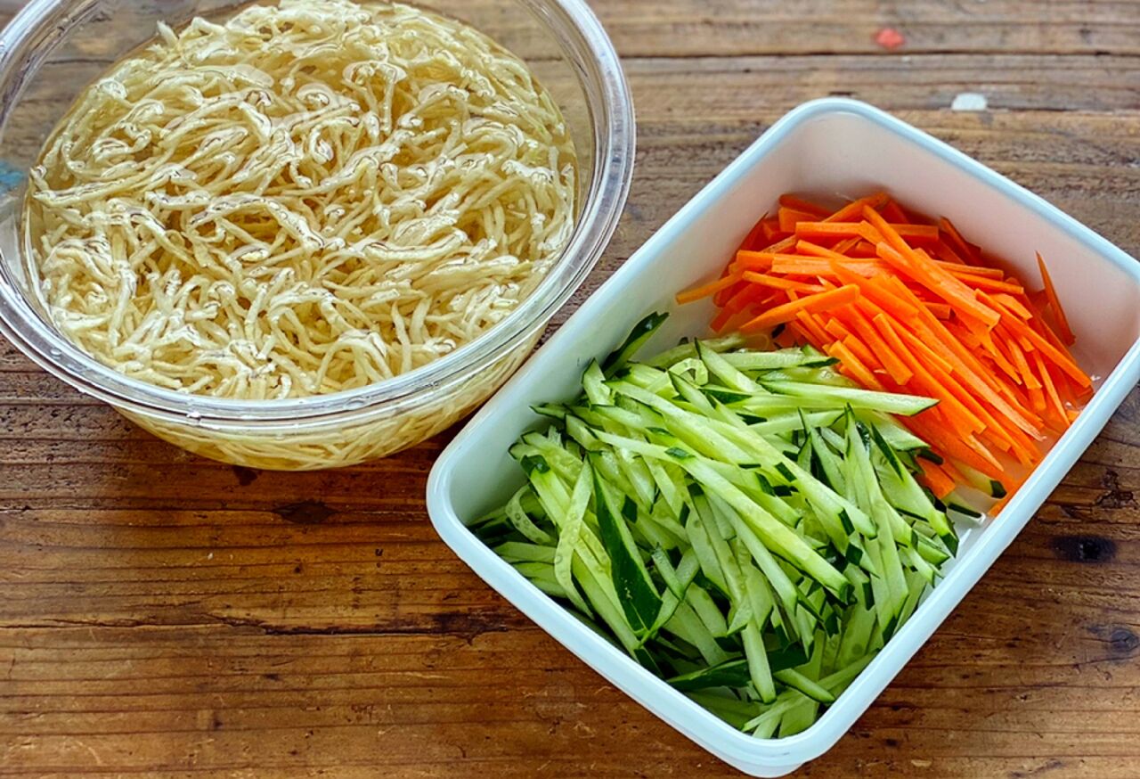 1.切り干し大根は水に浸けて戻し、水気を絞って食べやすい長さに切る。きゅうりと人参は細切りにする。