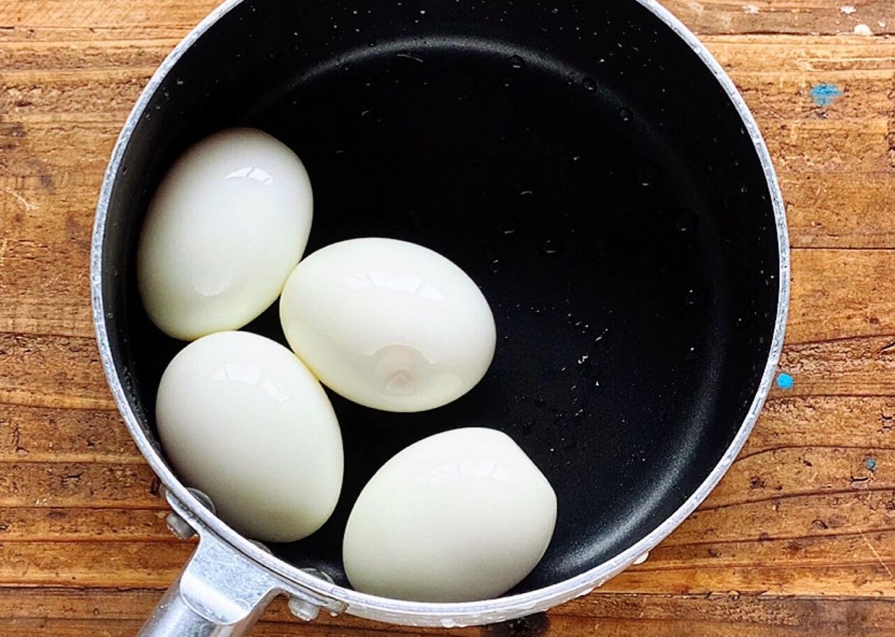 1.卵を好みのかたさに茹で、冷水で冷やして殻を剥く。(※今回は7分茹でました)