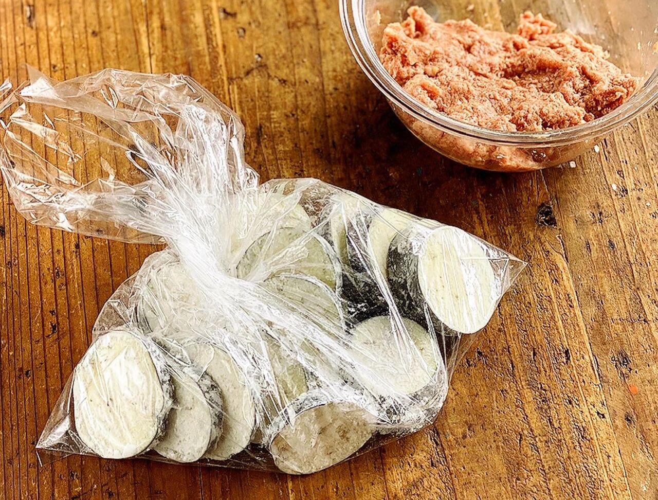 1.なすは5mm幅の輪切りにし、水に晒してしっかり水気を切る。ポリ袋に入れ、片栗粉を加えて振ってまぶす。ボウルに●を入れてよく混ぜ、肉だねを作る。☆は合わせておく。