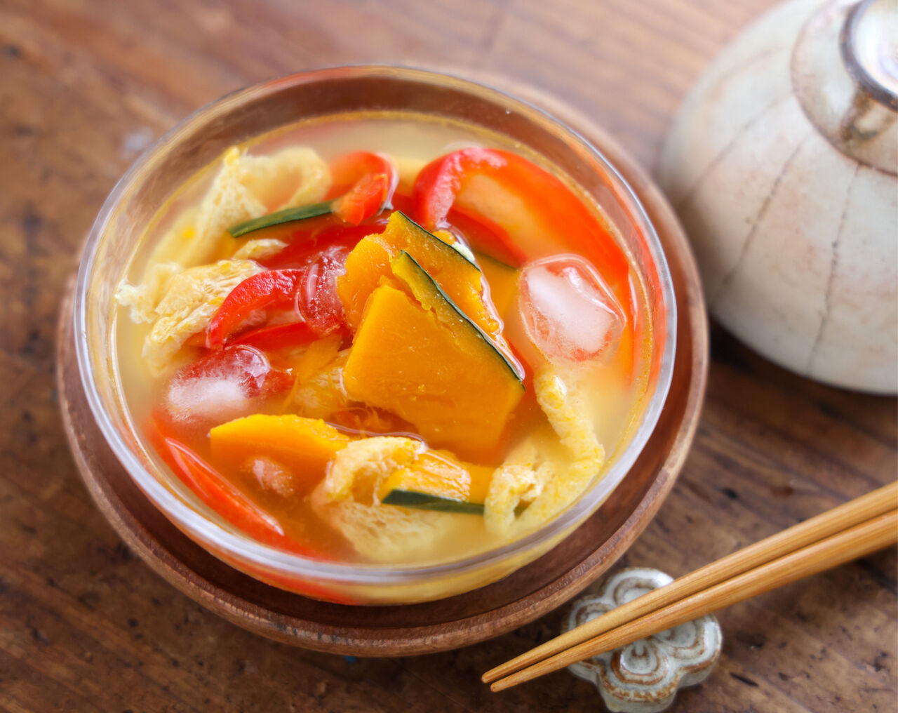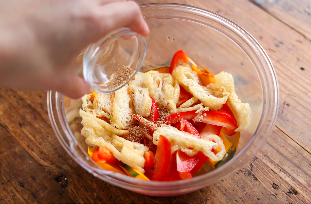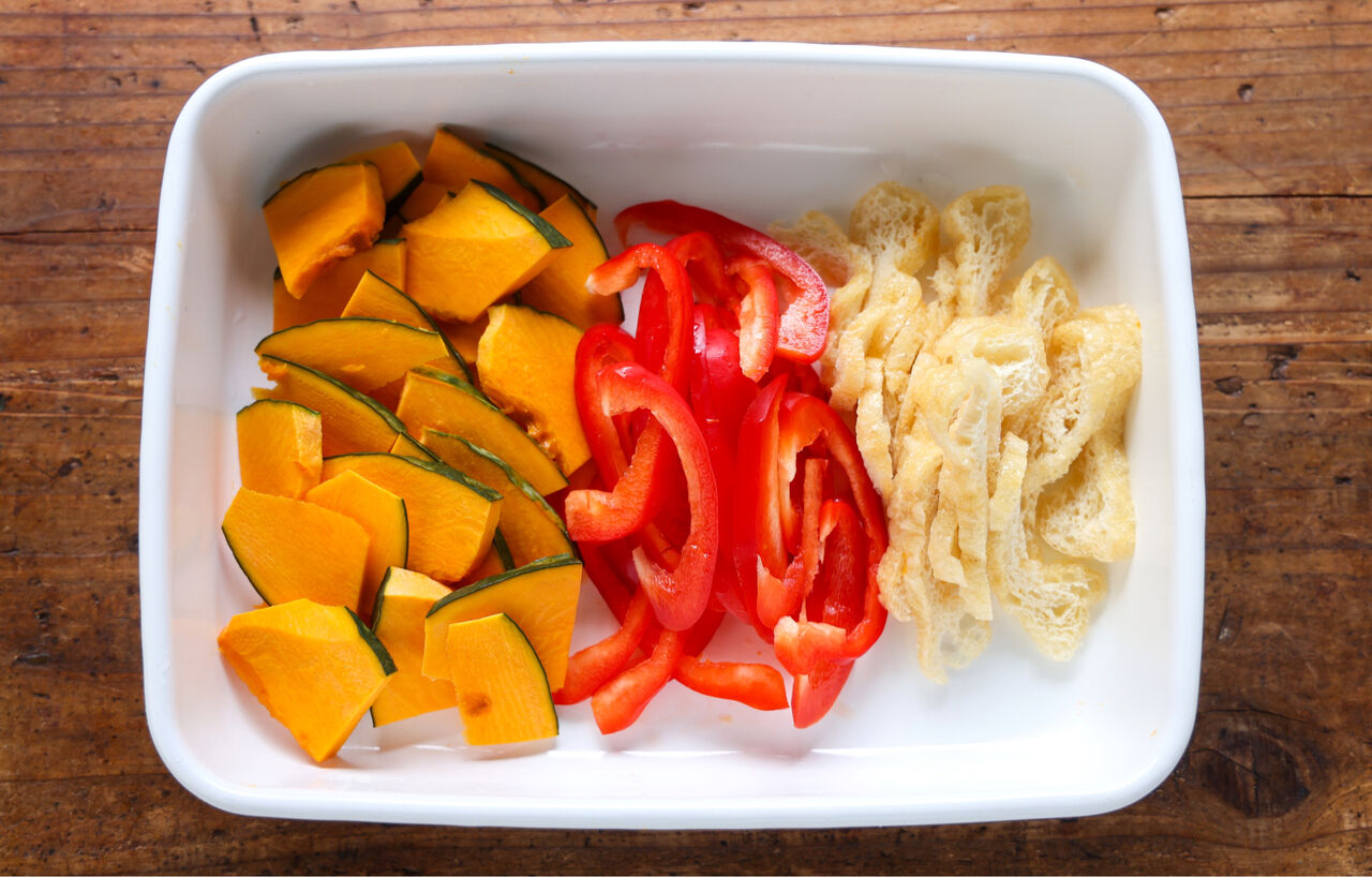 1.かぼちゃはワタと種を除いて5㎜幅の薄切りにし、食べやすい大きさに切る。油揚げは5㎜幅に切る。パプリカは縦薄切りにする。