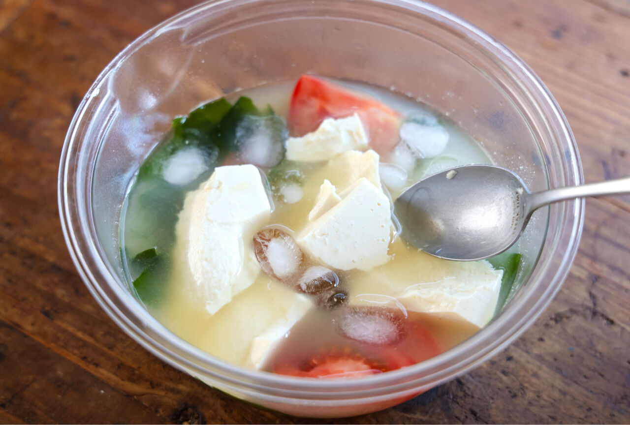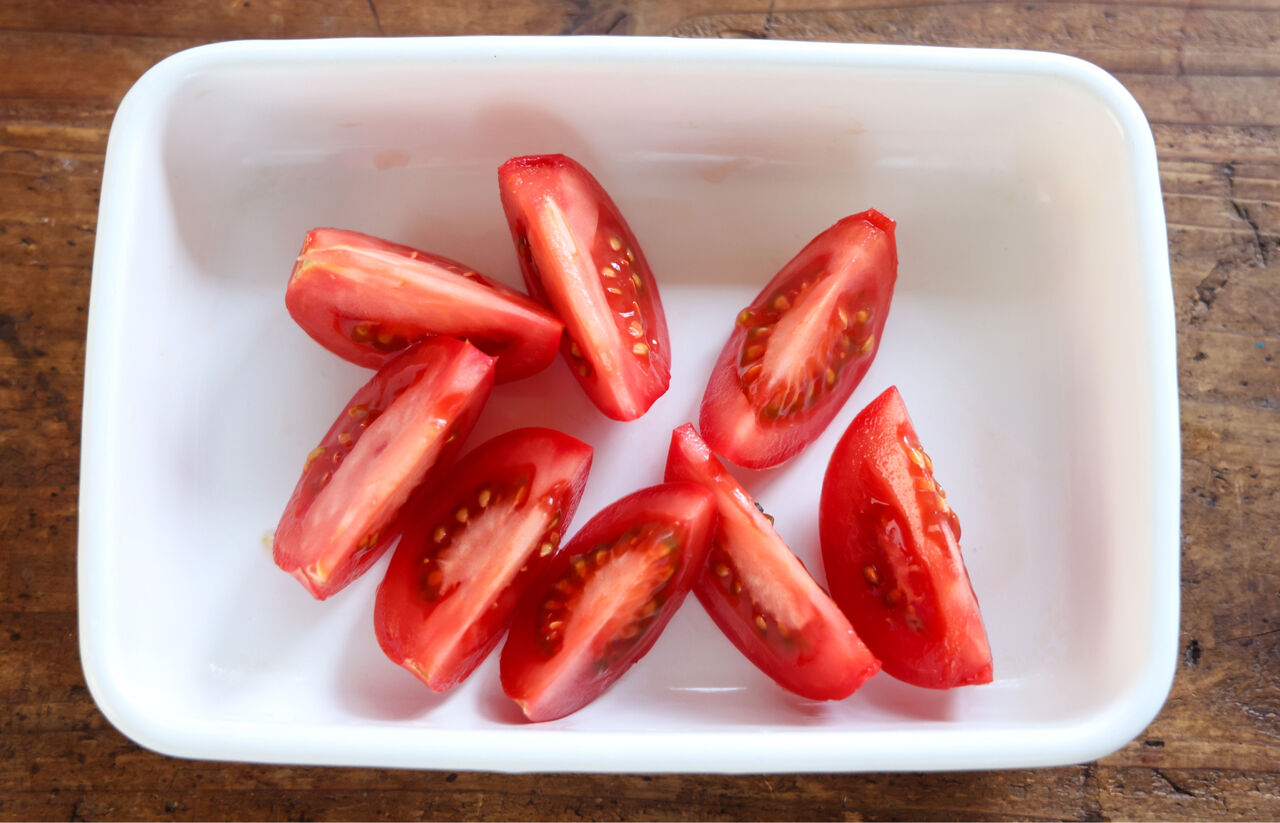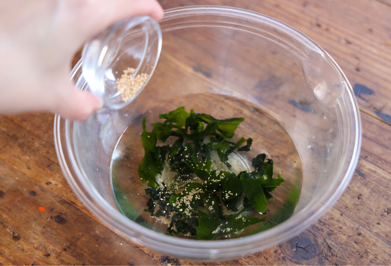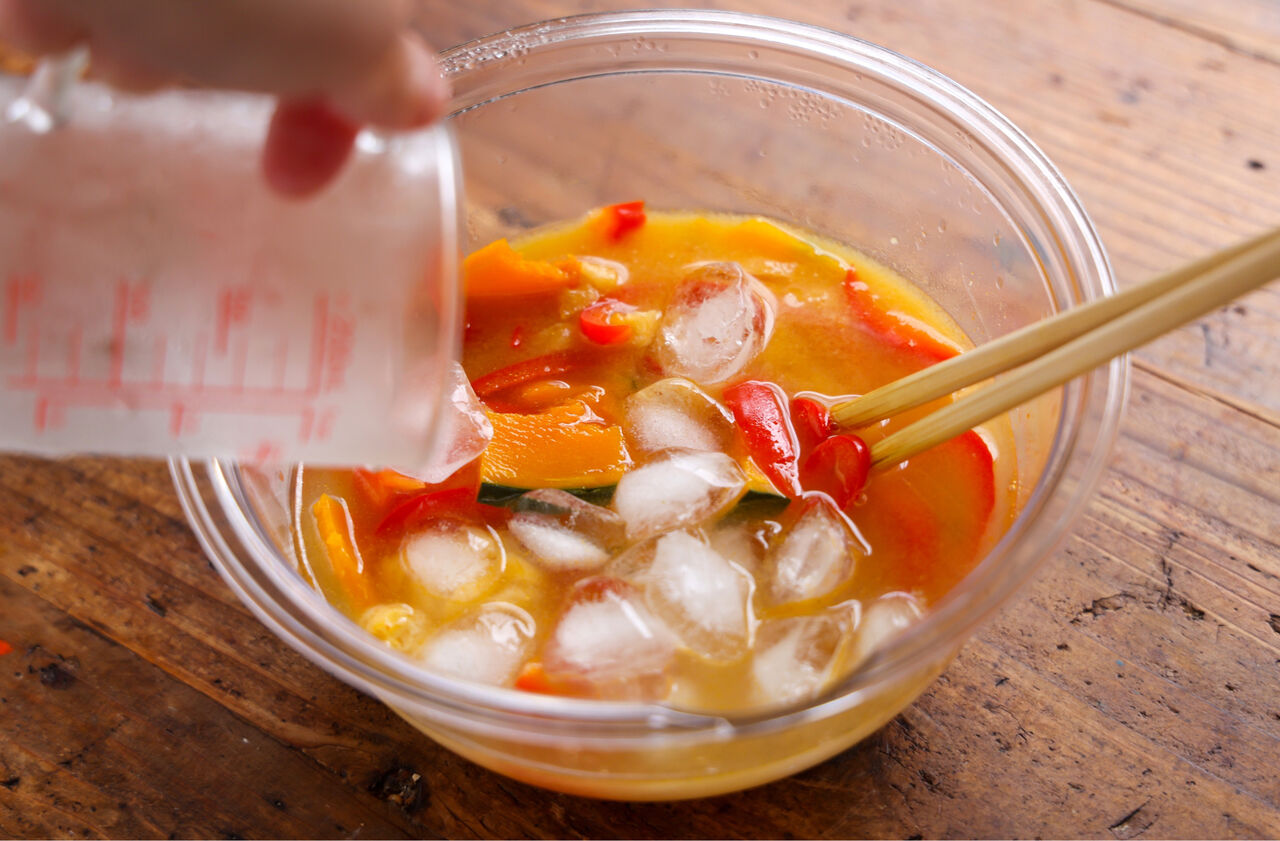 1.かぼちゃはワタと種を除いて5㎜幅の薄切りにし、食べやすい大きさに切る。油揚げは5㎜幅に切る。パプリカは縦薄切りにする。