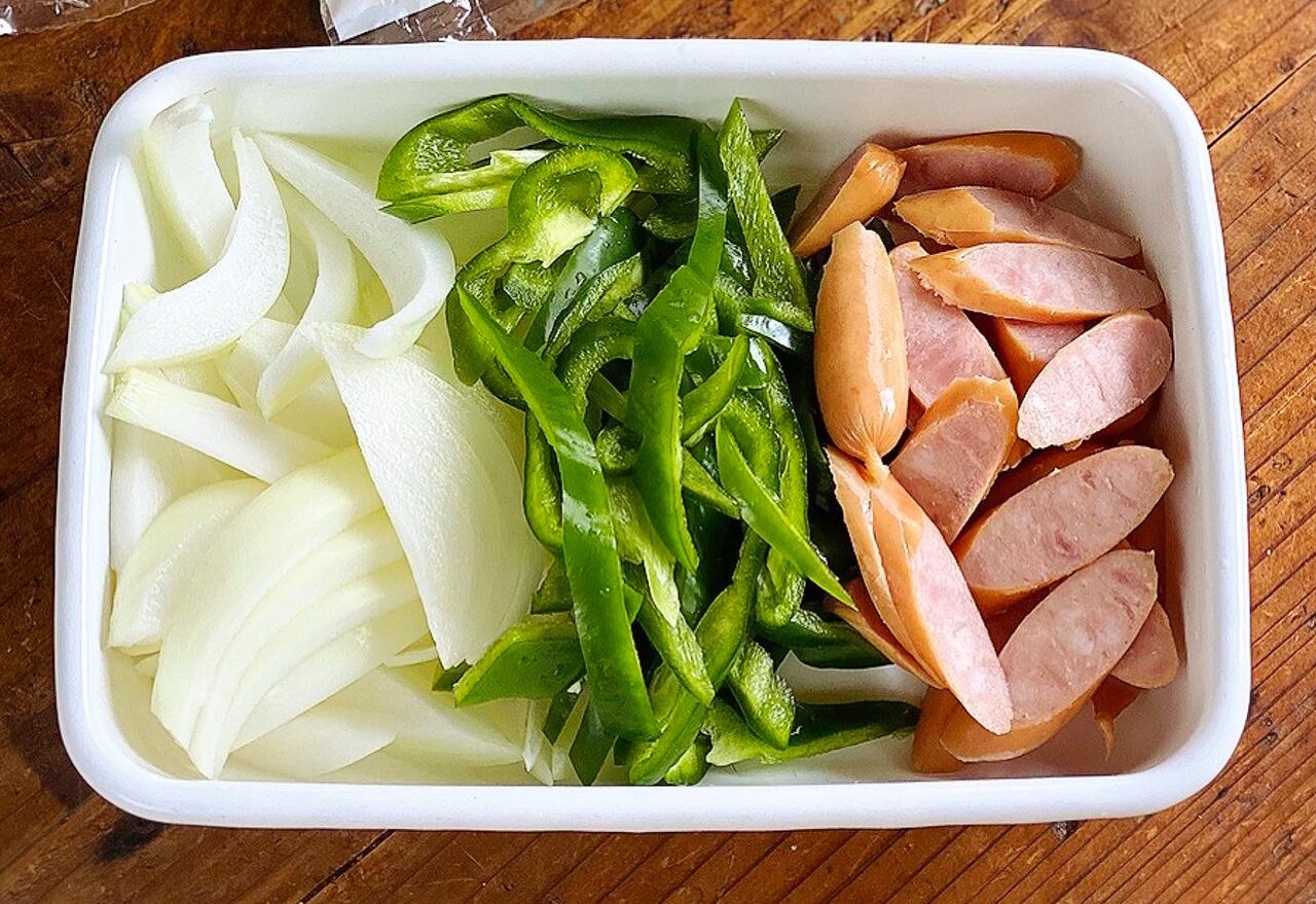 1.ウインナーは斜め薄切りにする。玉ねぎとピーマンは8mm幅に切る。焼きそばは袋に1か所穴を空け、600Wのレンジで2分加熱する。
