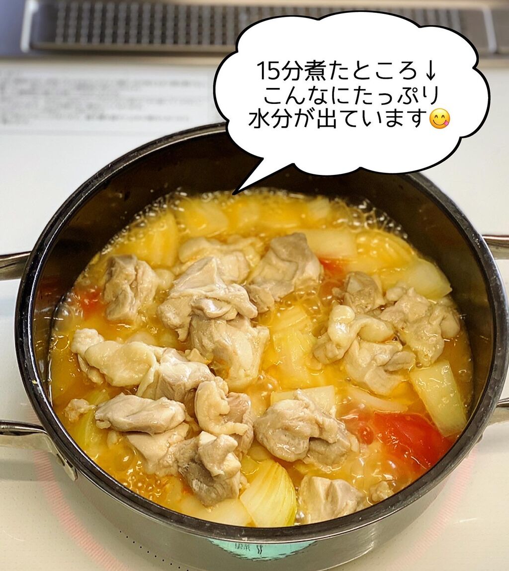 1.鶏肉、トマト、玉ねぎは一口大に切る。鍋にトマト、玉ねぎ、●を入れてざっくり混ぜ、鶏肉を広げてのせる。