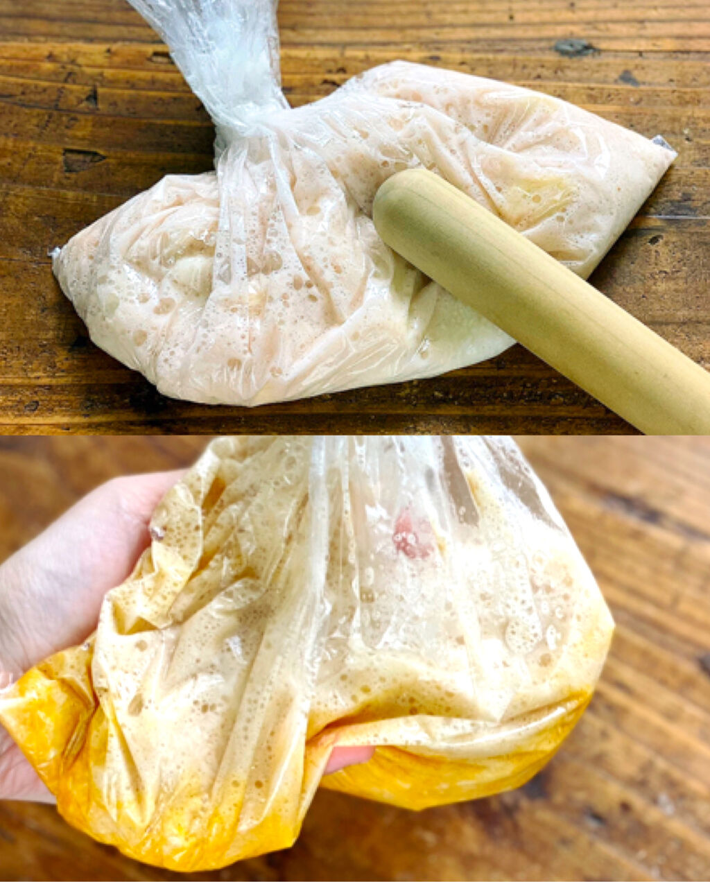 1.長芋はポリ袋に入れ、麺棒などで叩いてつぶし(多少かたまりが残ってもOK)、●を加えて揉んで混ぜる。