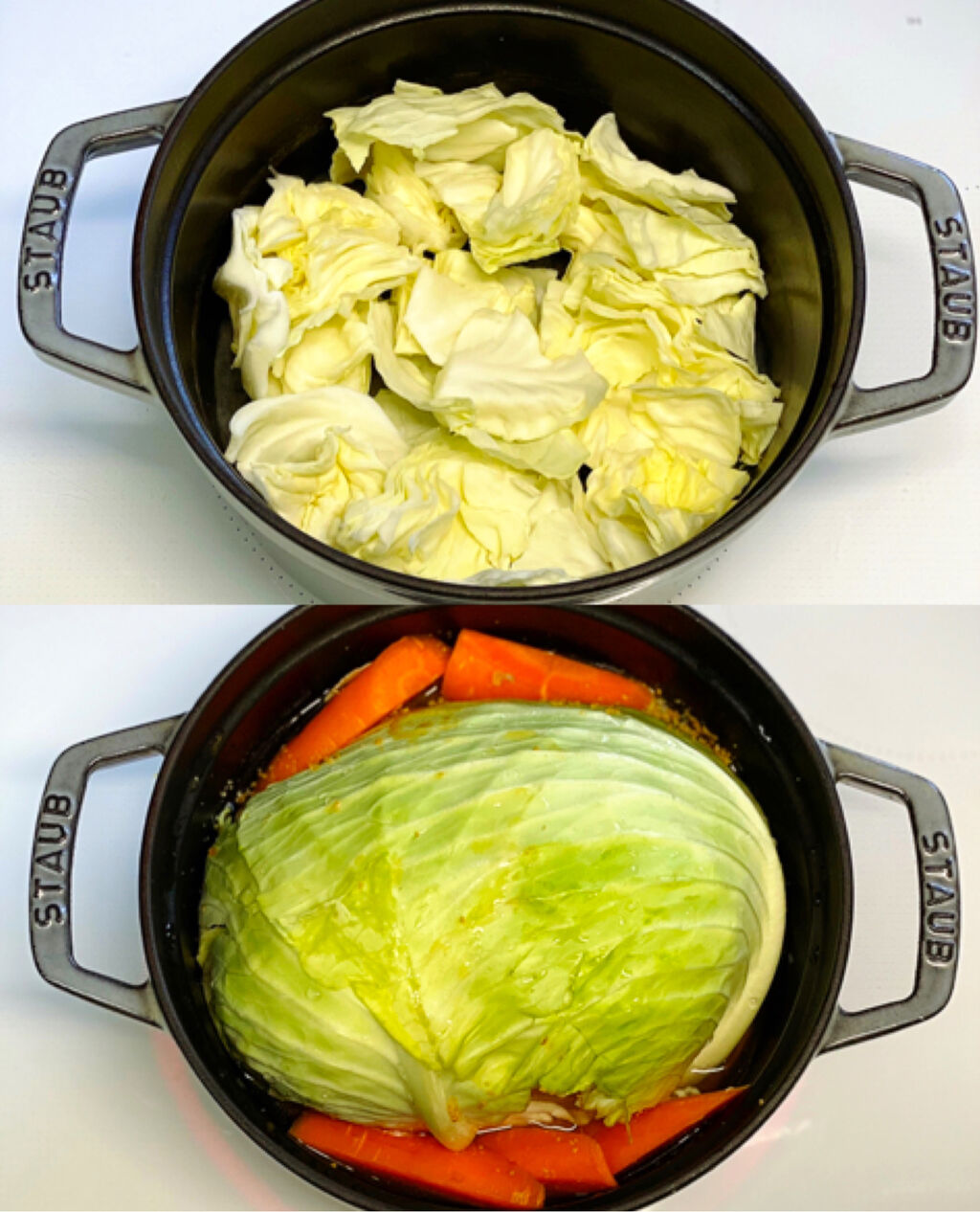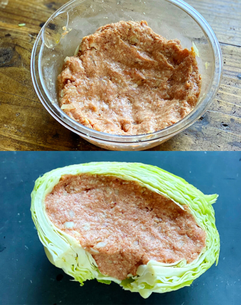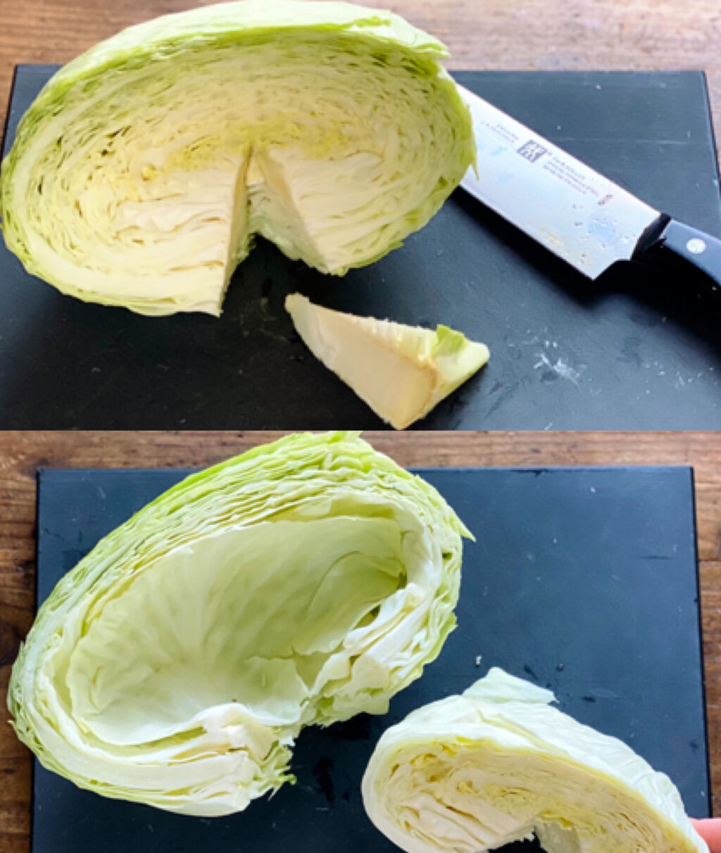 1.キャベツは芯を切り取り、中心部分の葉を半分程度はがして空洞を作る。はがした部分はざく切りにする。