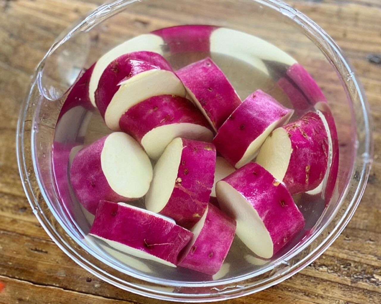1.さつまいもは1.5~2cm幅の輪切り(大きければ半月切り)にし、水に5分晒して水気を切る。