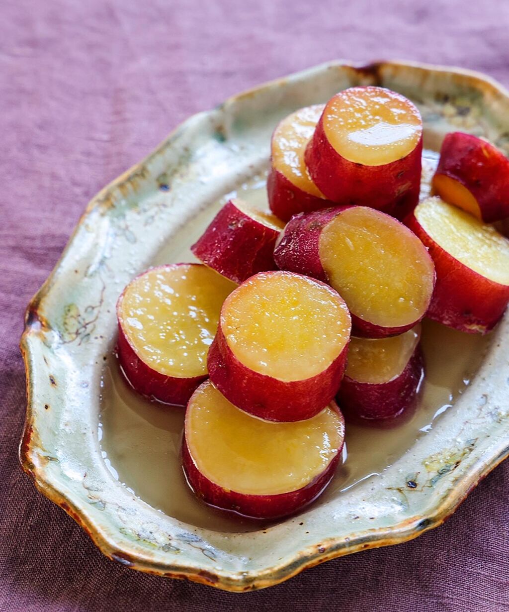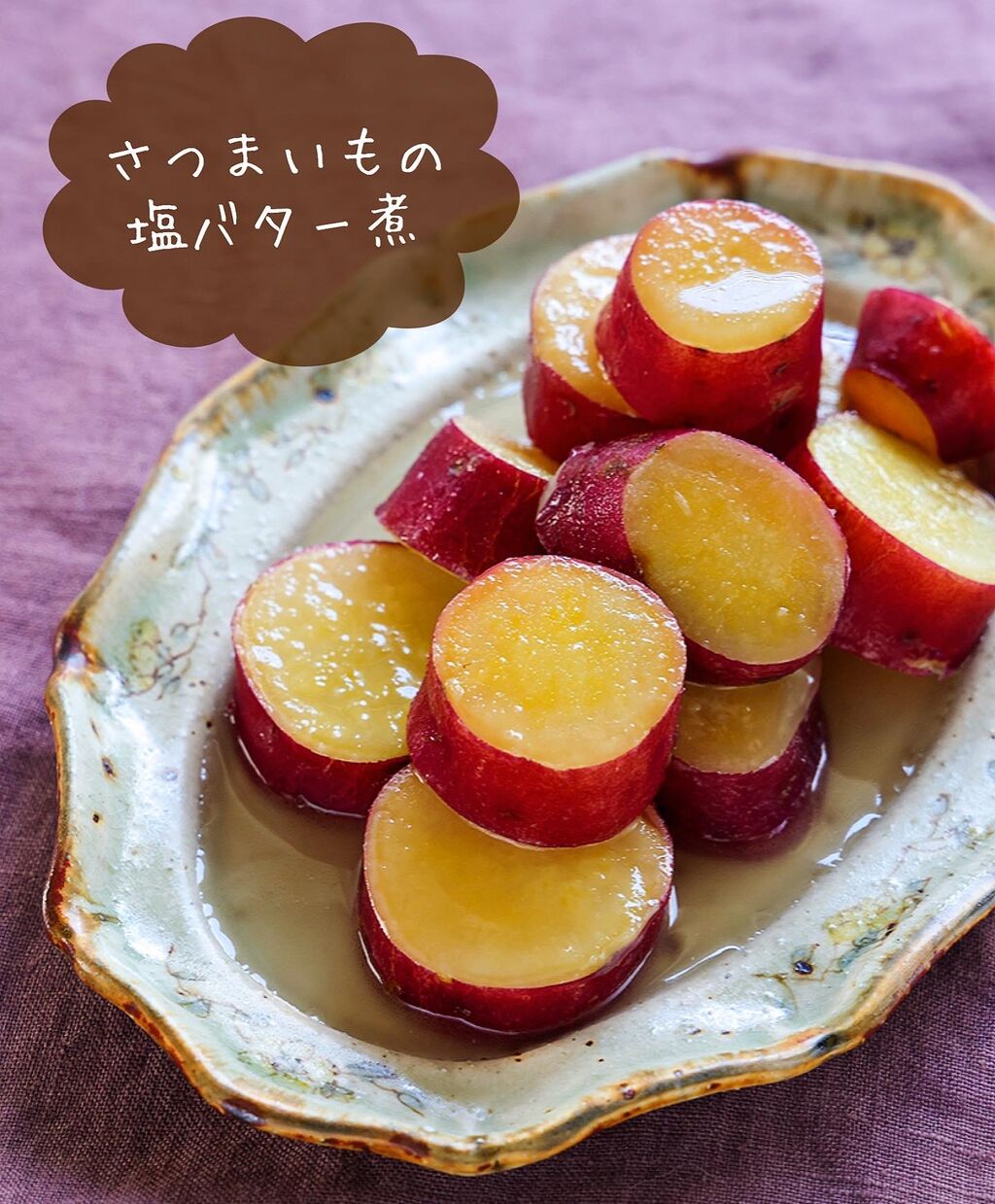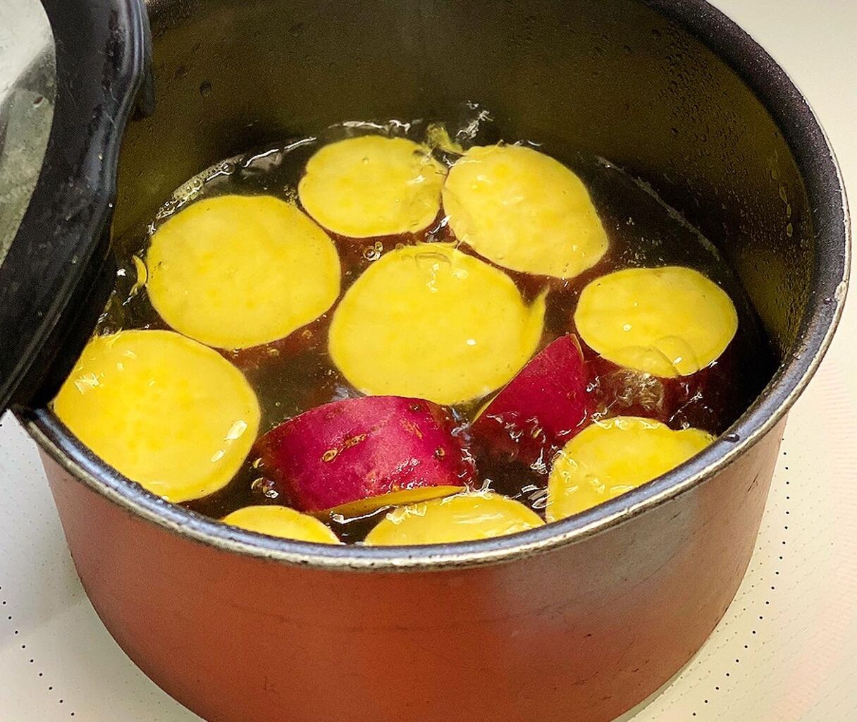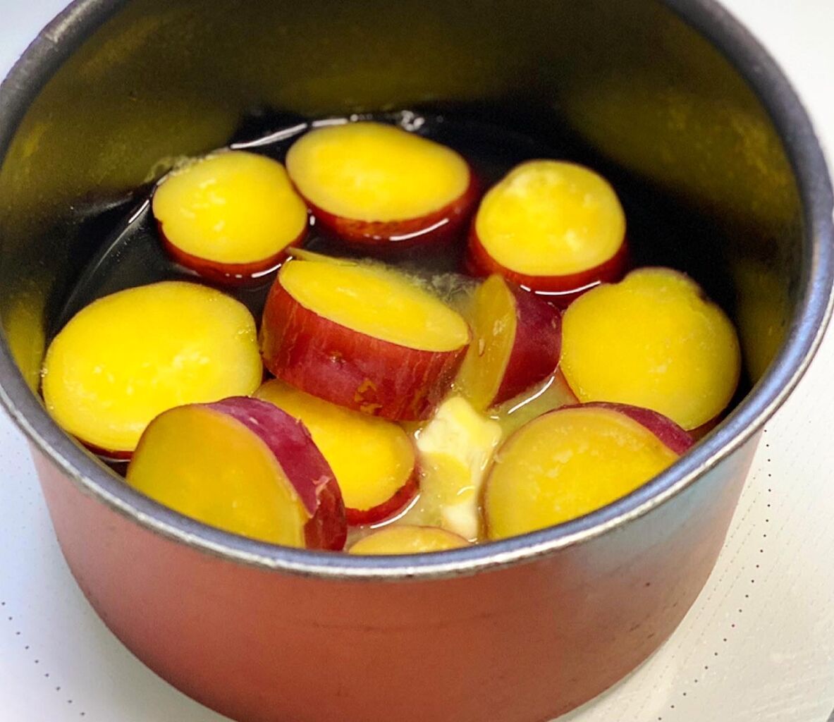 3.さつまいもが柔らかくなったら火を止め、バターを加えて余熱で溶かす。