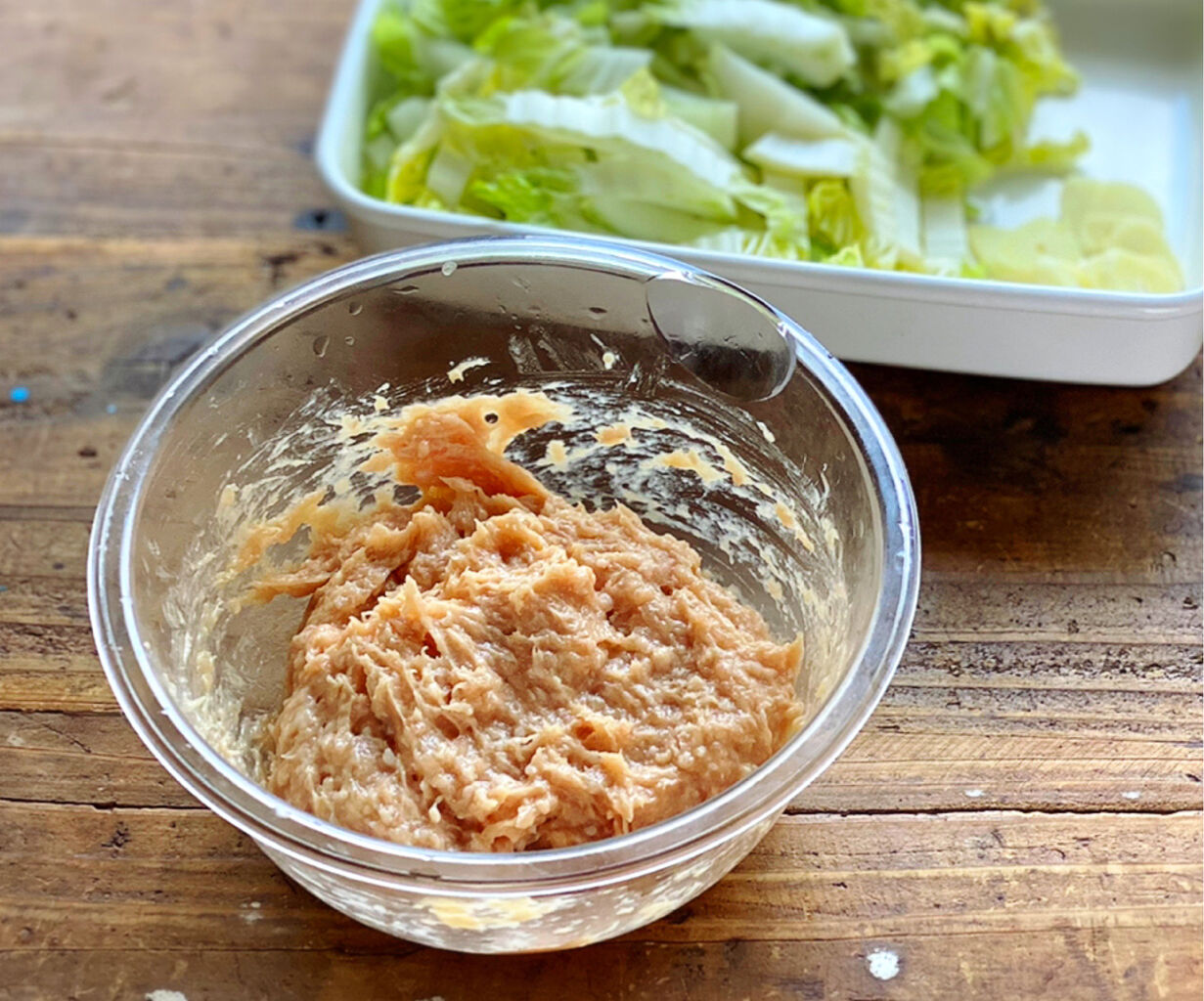 1.ボウルに●を入れてよく混ぜる。白菜は1cm幅に切る。にんにくは薄切りにする。