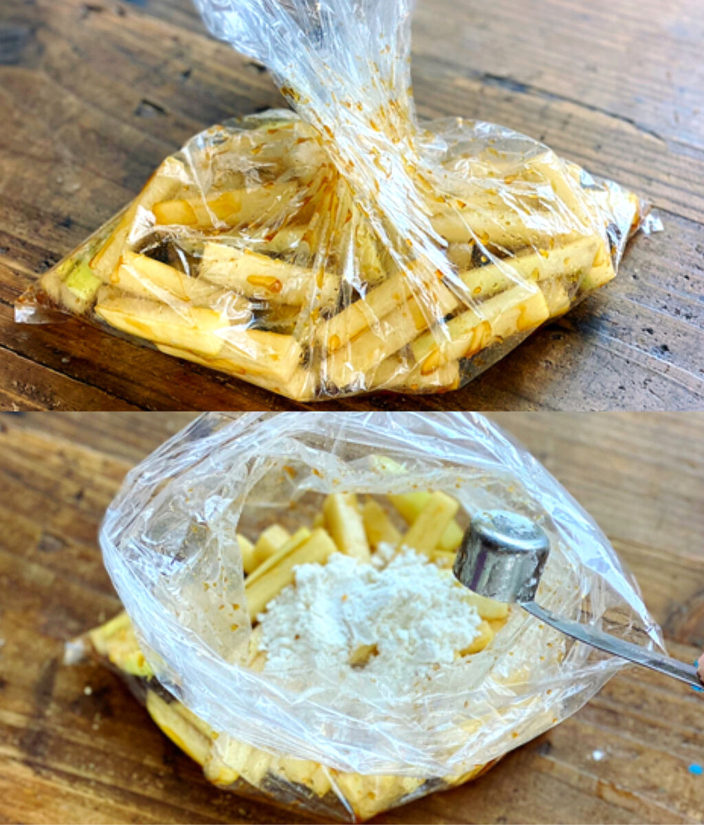 1.大根は皮ごと長さを半分に切り、1cm四方の棒状に切る。ポリ袋に入れ、●を揉み込み5分置く。次に薄力粉も加えて更に揉み込む。