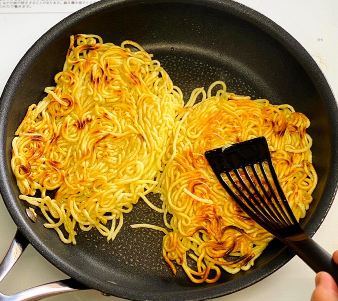 1.焼きそばは袋の上から揉んでほぐす。小松菜は4cm長さに切る。しいたけは薄切りにする。●は合わせておく。