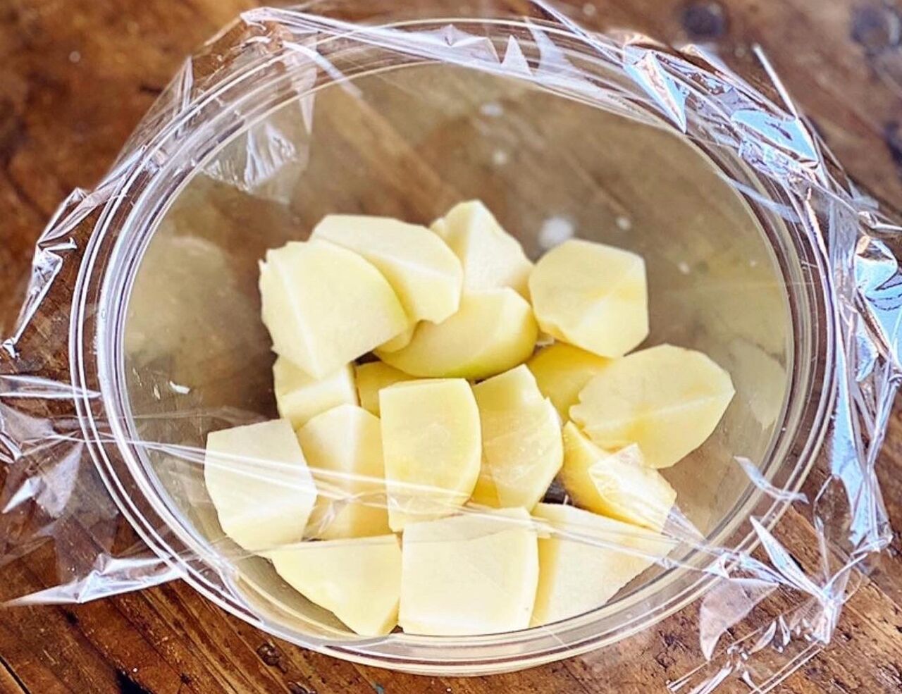 1.じゃがいもは皮を剥いて3㎝大に切る。耐熱ボウルに入れてふんわりラップをかけ、600Wのレンジで7分加熱する。