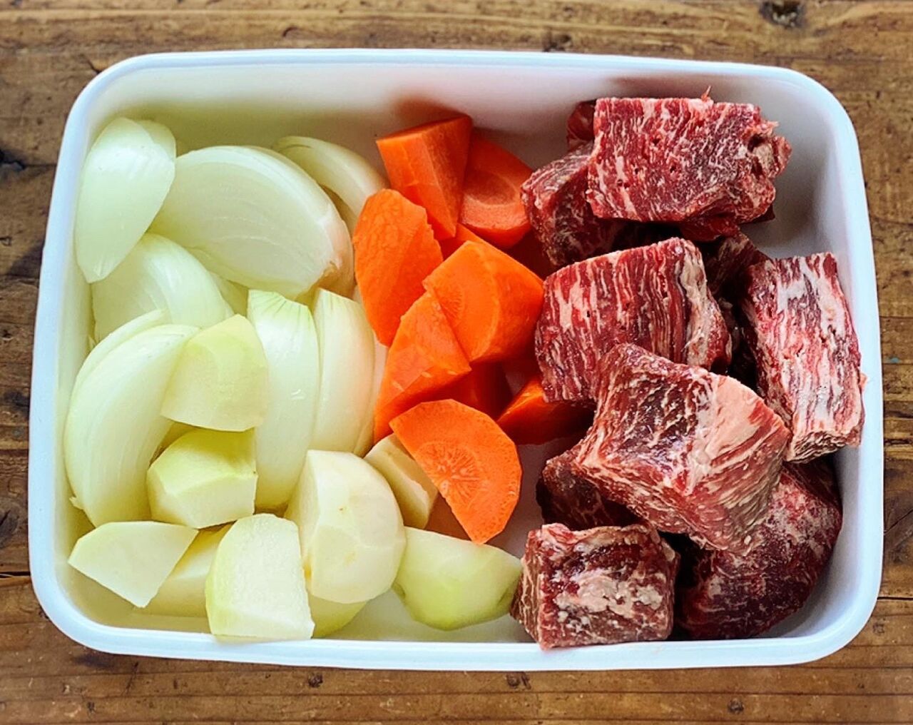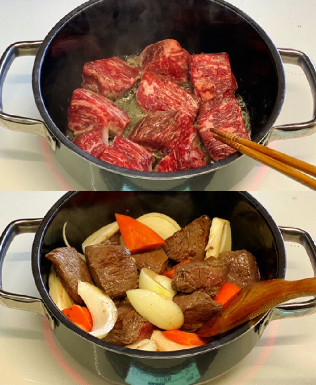 1.牛肉は全体をフォークで刺し、塩、こしょうをすり込む。玉ねぎは1.5cm幅のくし形に切り、人参とじゃがいもは3cm大の乱切りにする。