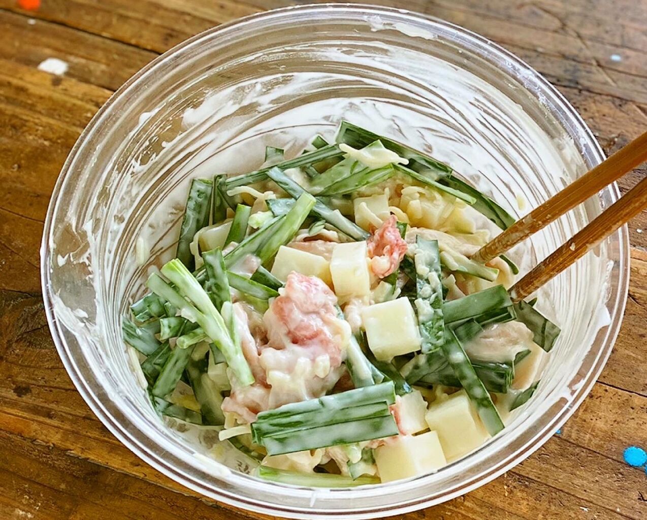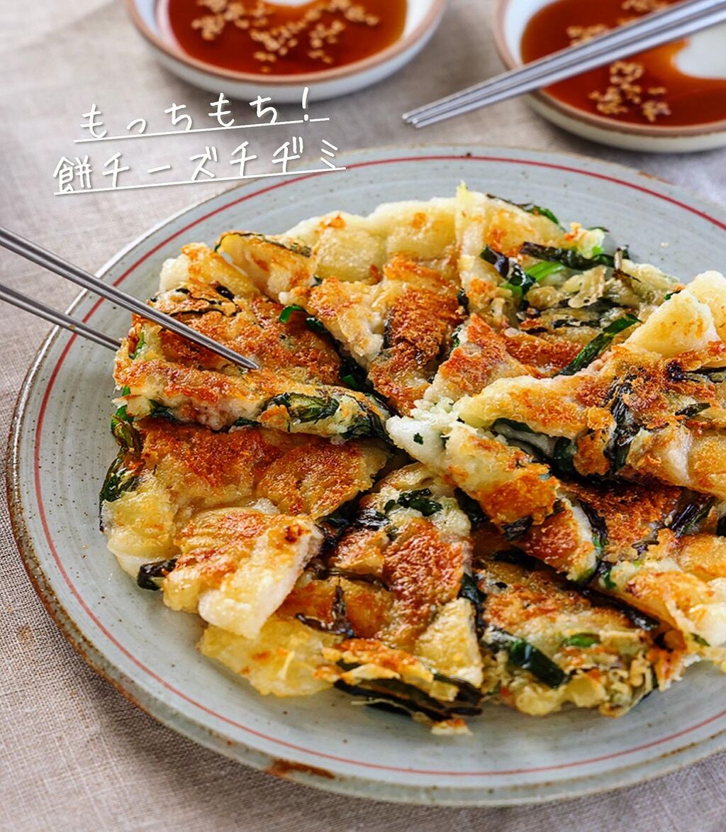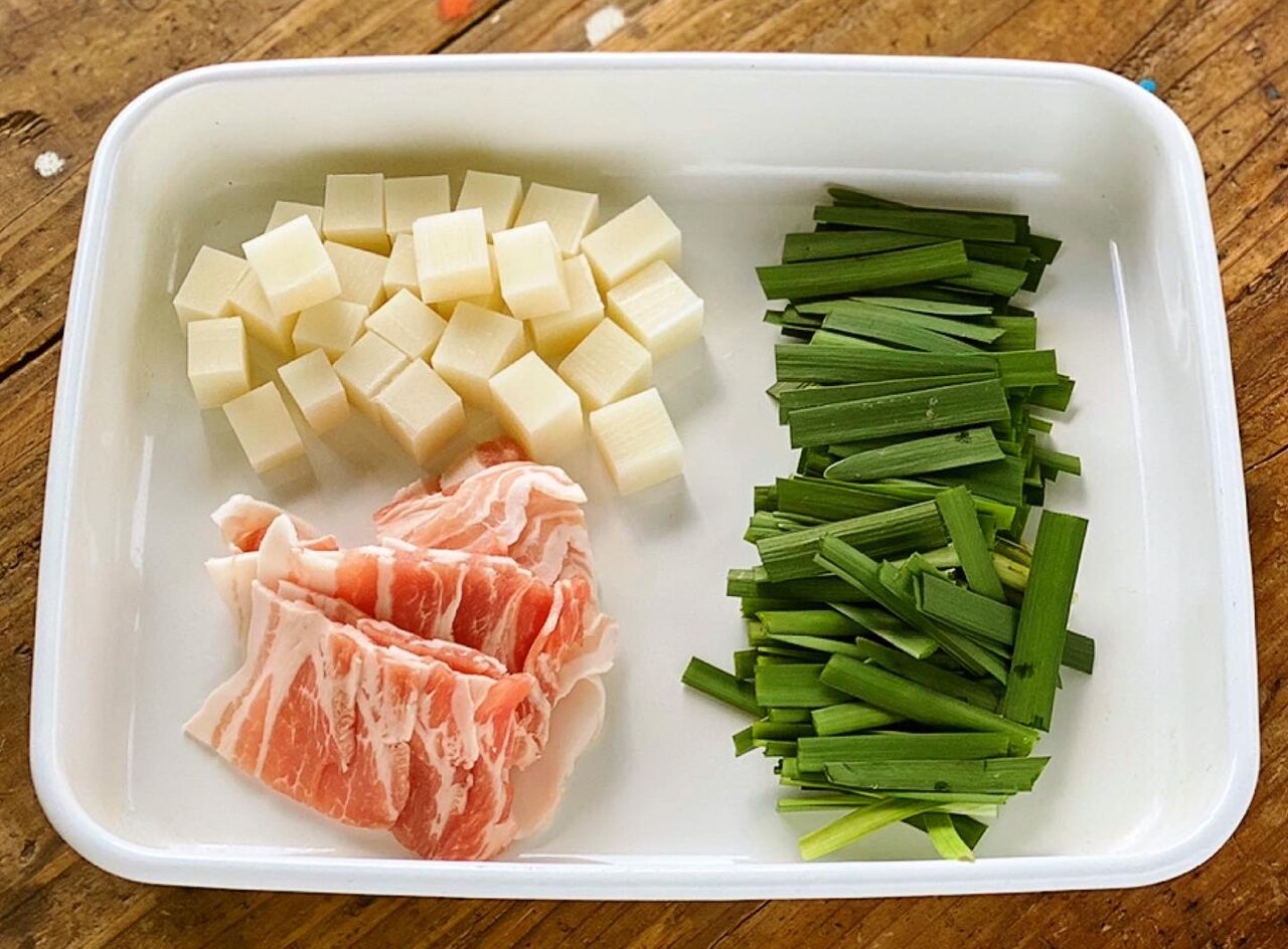 1.餅は1cm角に切る。豚肉とニラは3cm長さに切る。ボウルに●を入れて混ぜ、餅、豚肉、ニラ、チーズを加えて混ぜる。