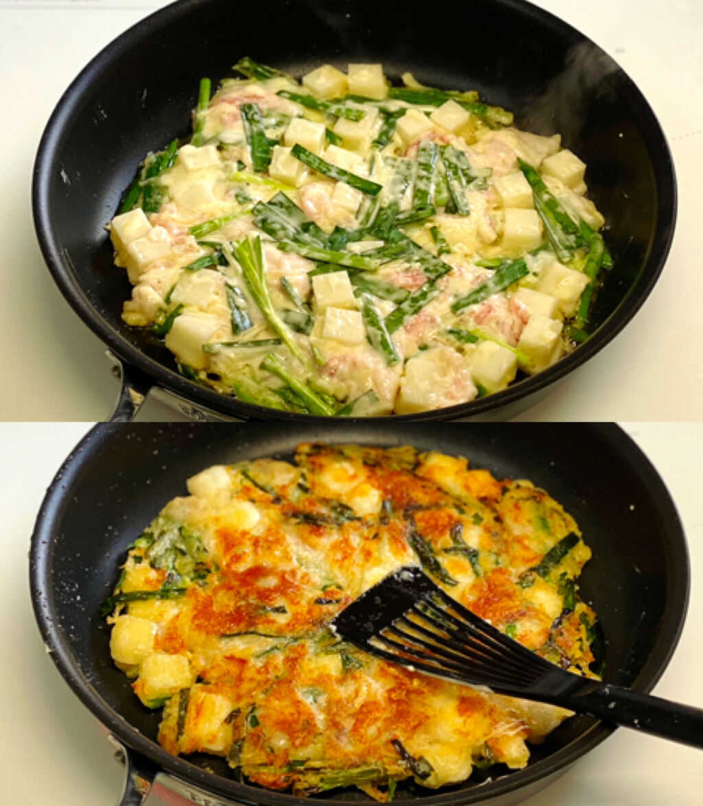♦︎ひっくり返す時はお皿にスライドさせてからフライパンに戻す方法が便利です♩