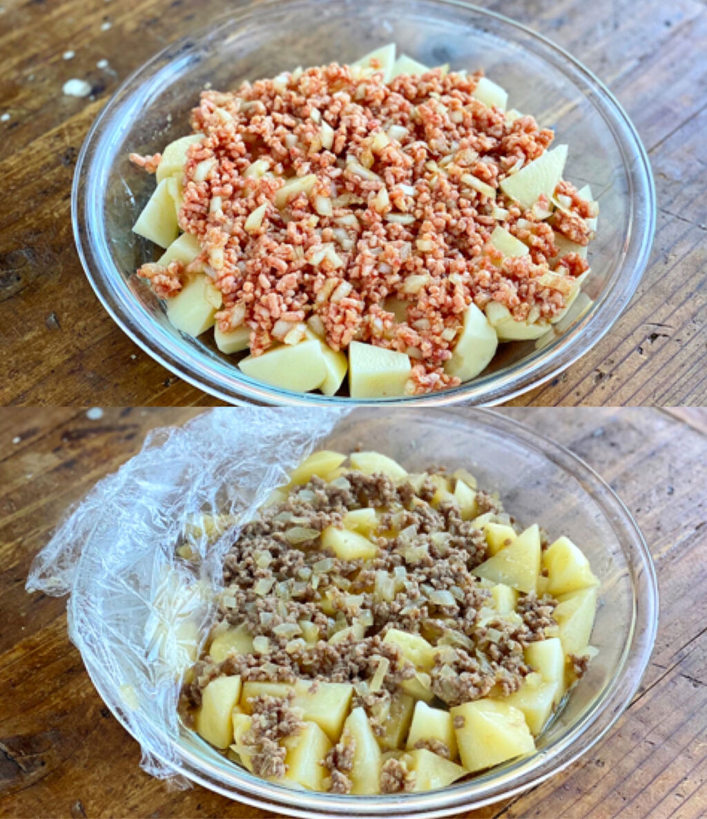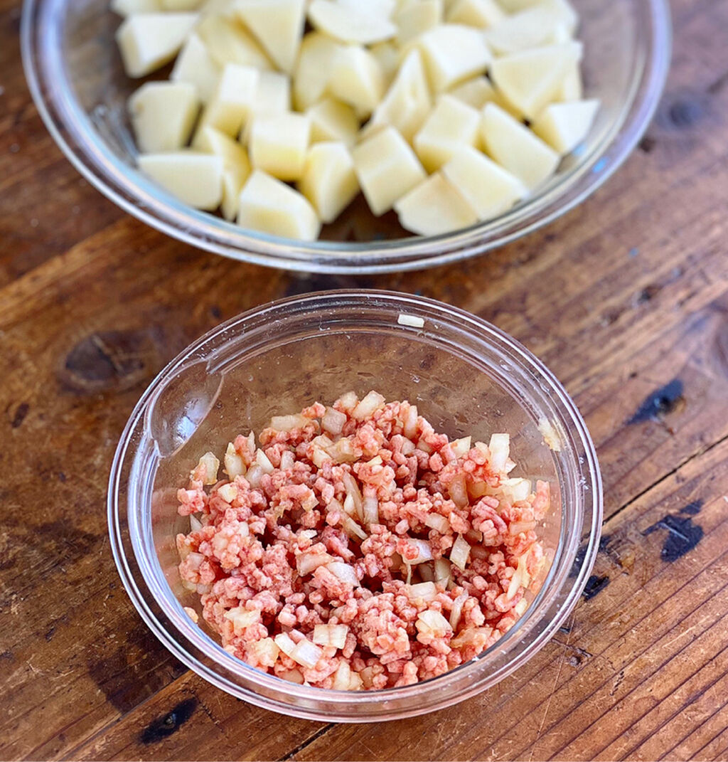 1.じゃがいもは2cm大に切り、玉ねぎはみじん切りにする。ボウルにひき肉、玉ねぎ、●を入れて菜箸で混ぜる。