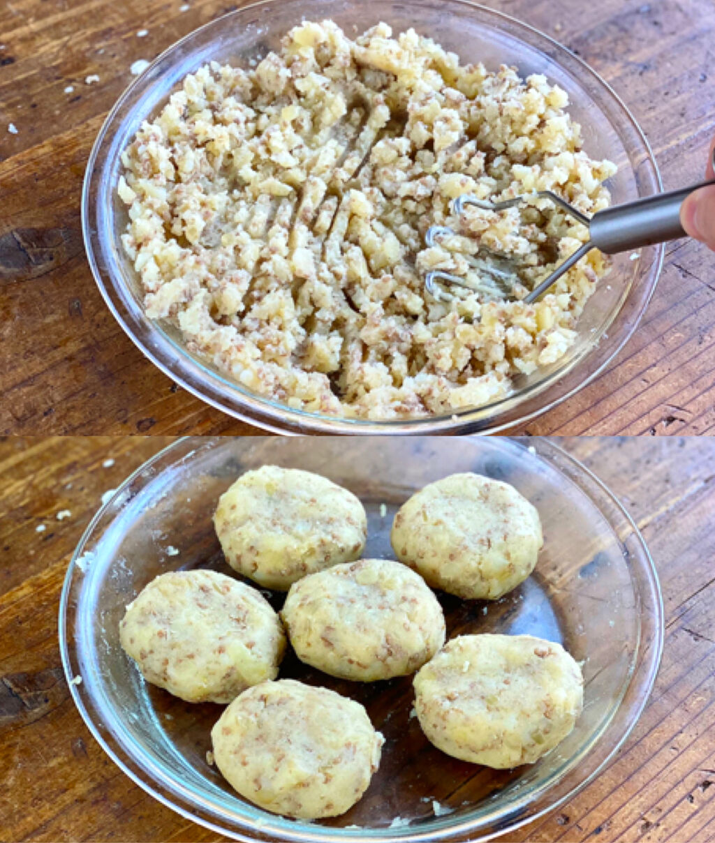 2.耐熱皿にじゃがいもを広げ、1の肉だねを広げてのせる。ふんわりラップをかけ、600Wのレンジで9分加熱し、熱い内につぶす。粗熱を取り、6等分の小判形にする。