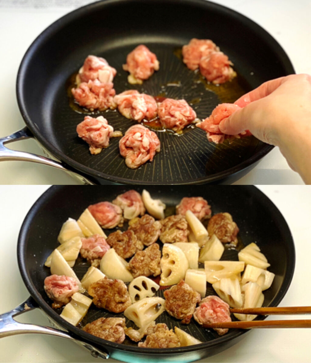 豚肉とれんこんを一緒に焼いて