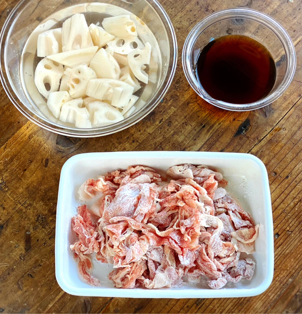 1.豚肉に塩こしょうと片栗粉をまぶす。れんこんは一口大に切り、水に3分晒して水気を切る。●は合わせておく。