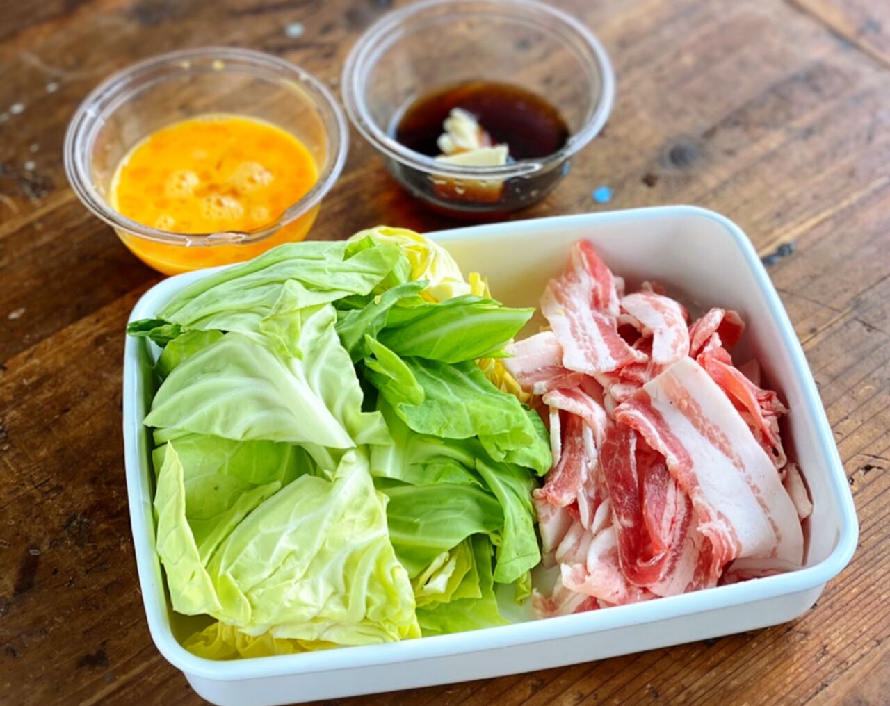 1.豚肉は5cm長さに切り、塩こしょうと片栗粉をまぶす。キャベツはざく切りにする。卵は溶きほぐす。●は合わせておく。
