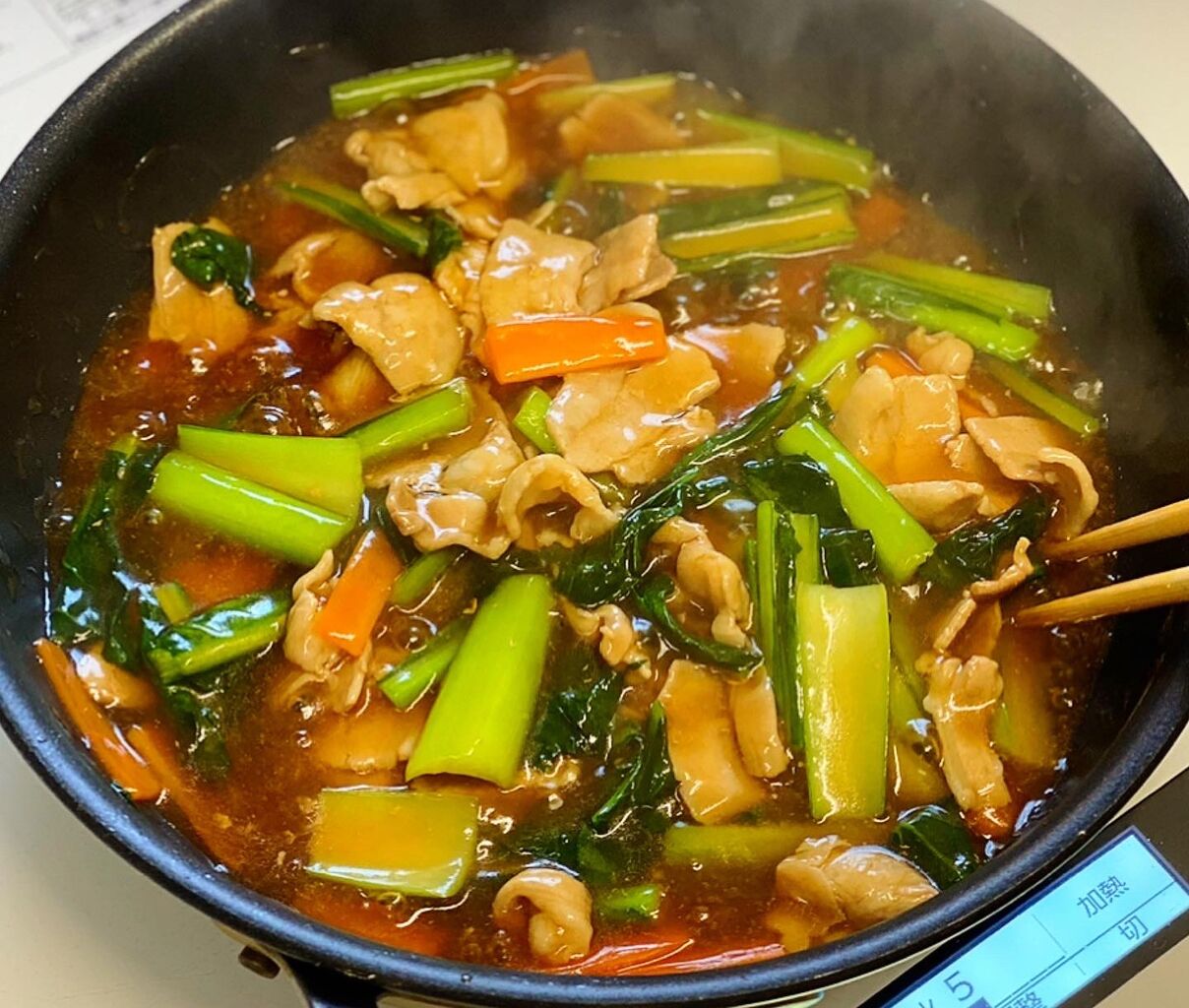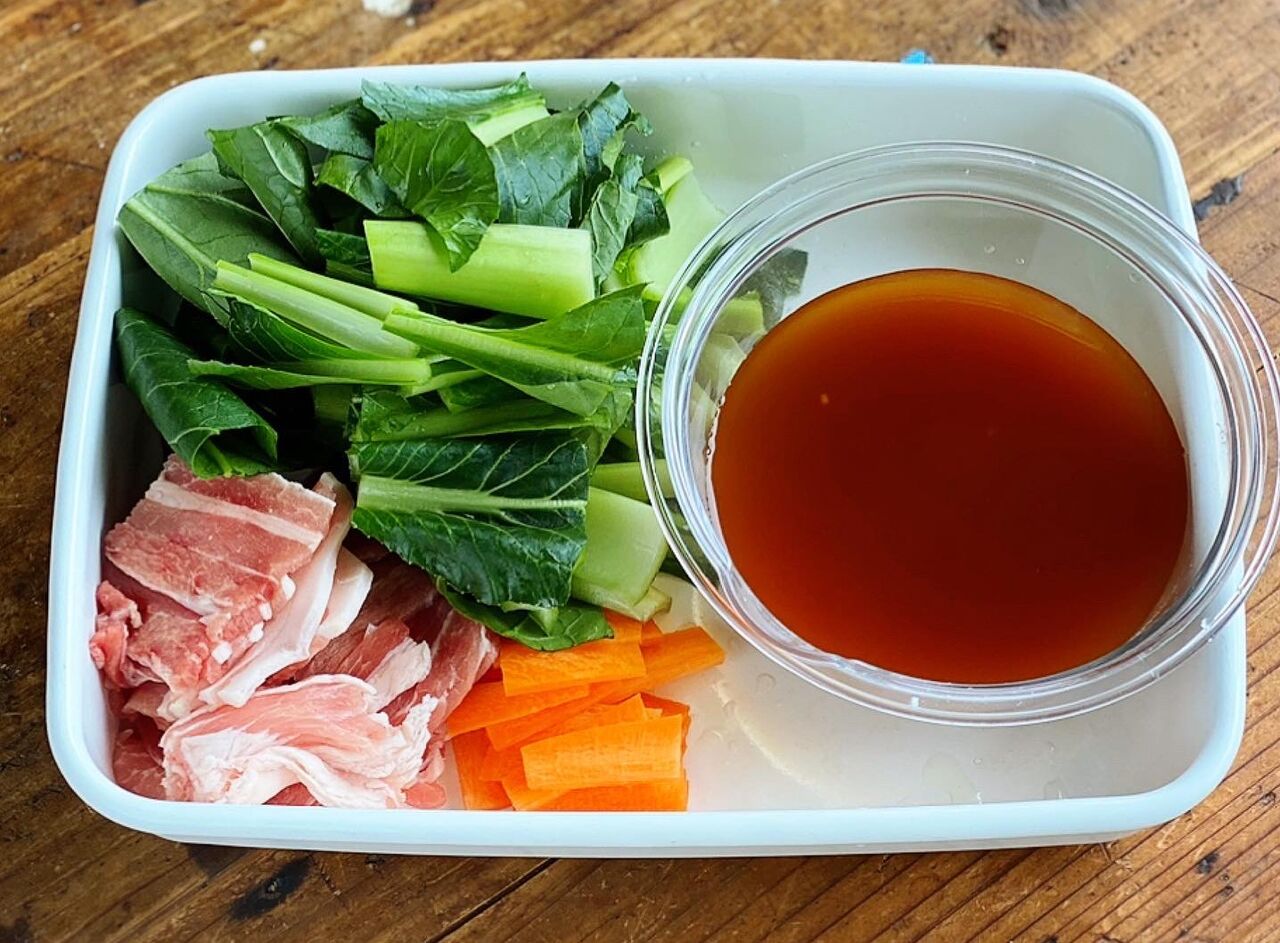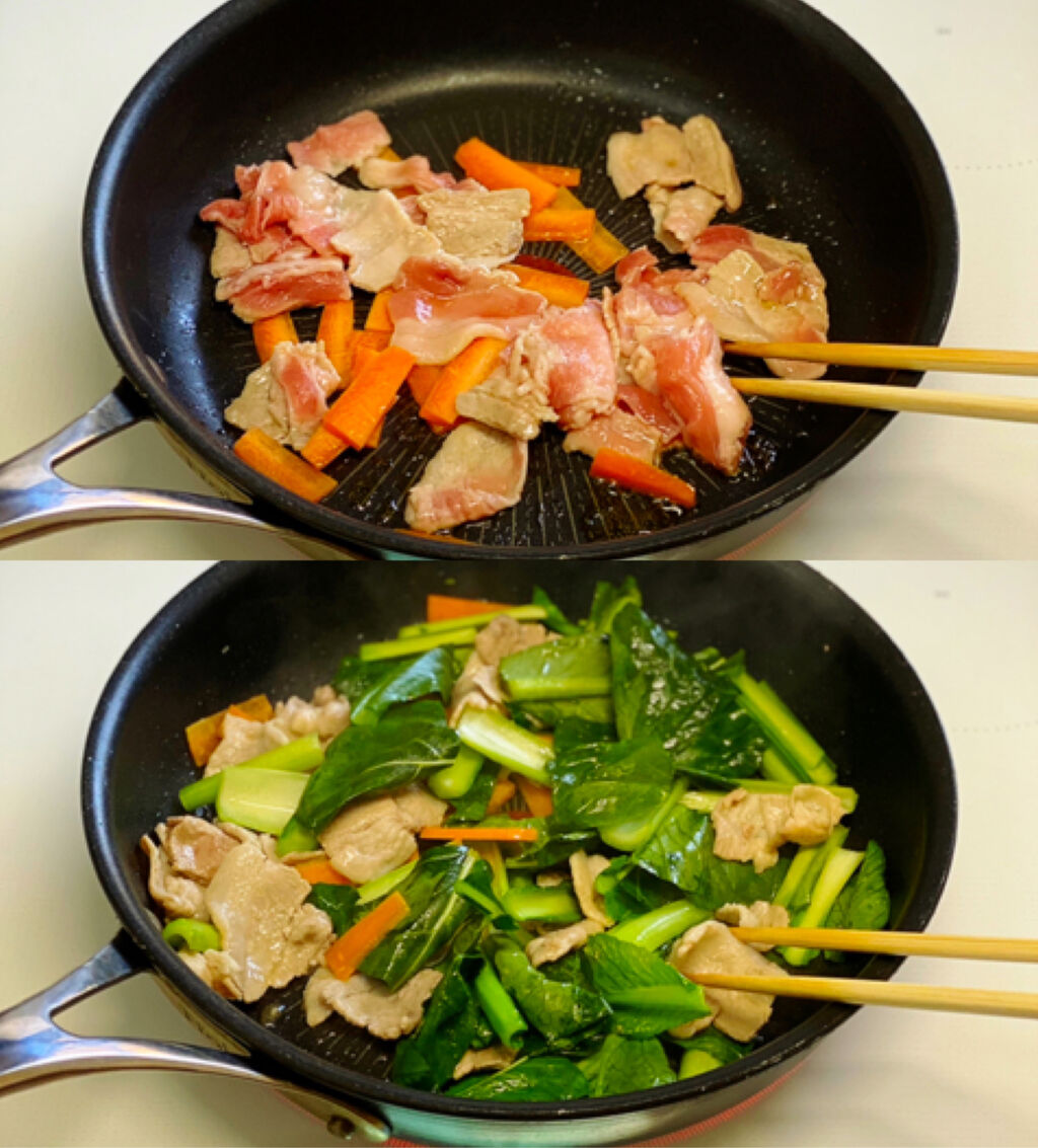1.豚肉と小松菜は3cm長さに切る。人参は短冊切りにする。●は合わせておく。