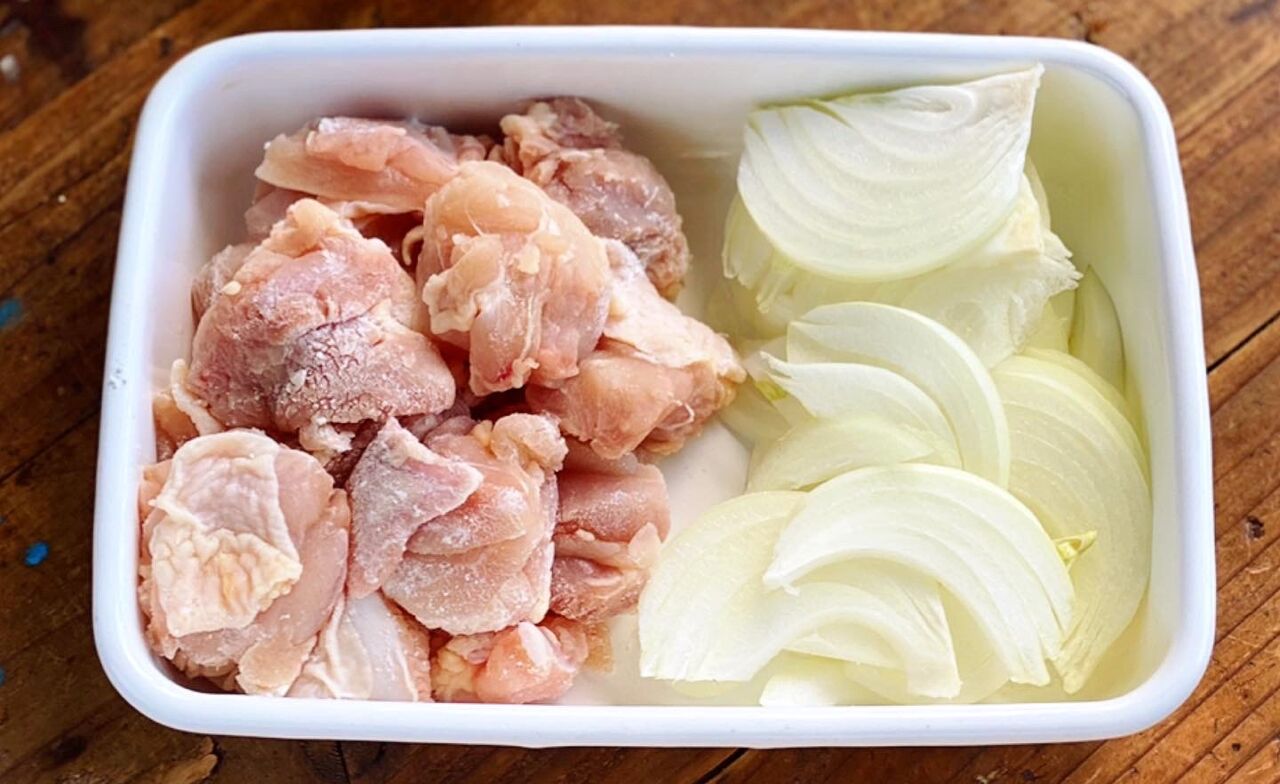 1.鶏肉は3cm大に切って片栗粉をまぶす。玉ねぎは薄切りにする。卵は溶きほぐす。