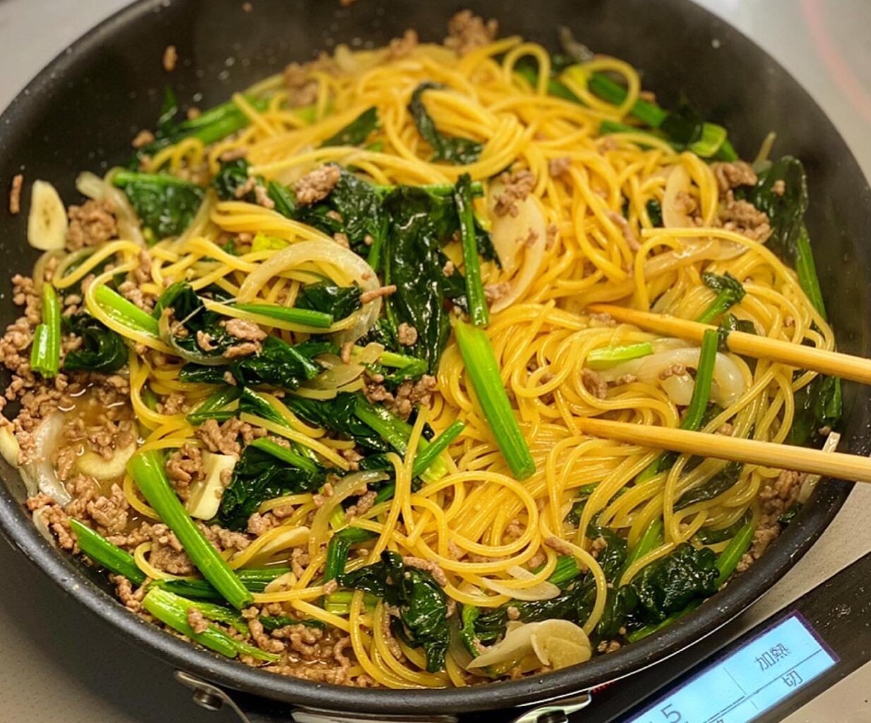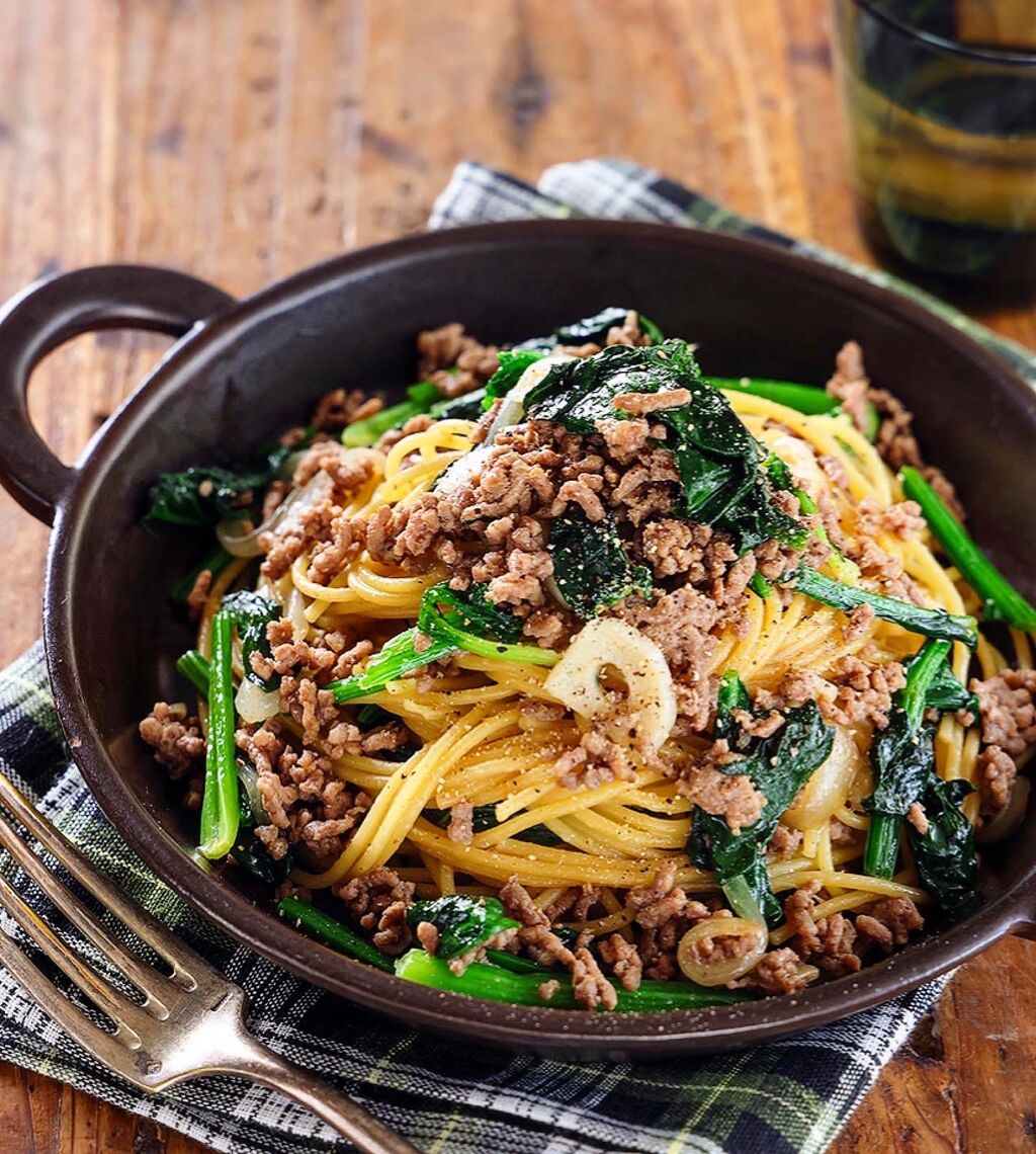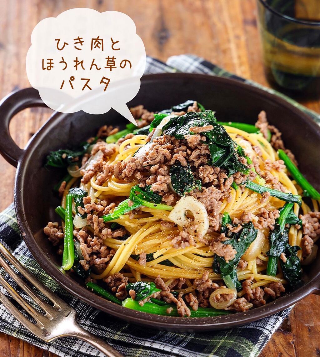 ひき肉とほうれん草のバター醤油パスタ
