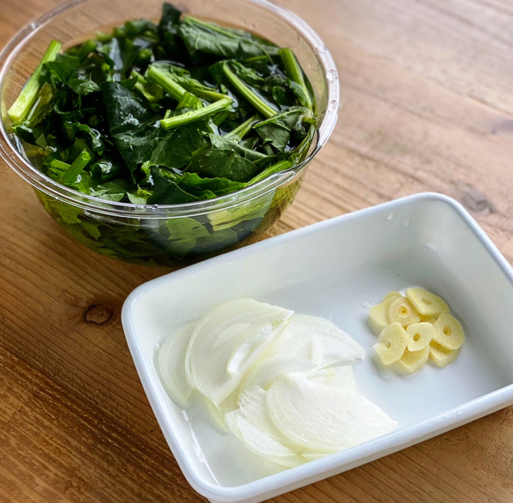 1.ほうれん草は4cm長さに切り、水に10分晒して水気を切る。玉ねぎとにんにくは薄切りにする。パスタは塩(分量外)を加えた熱湯で表示時間より1分短く茹でる。