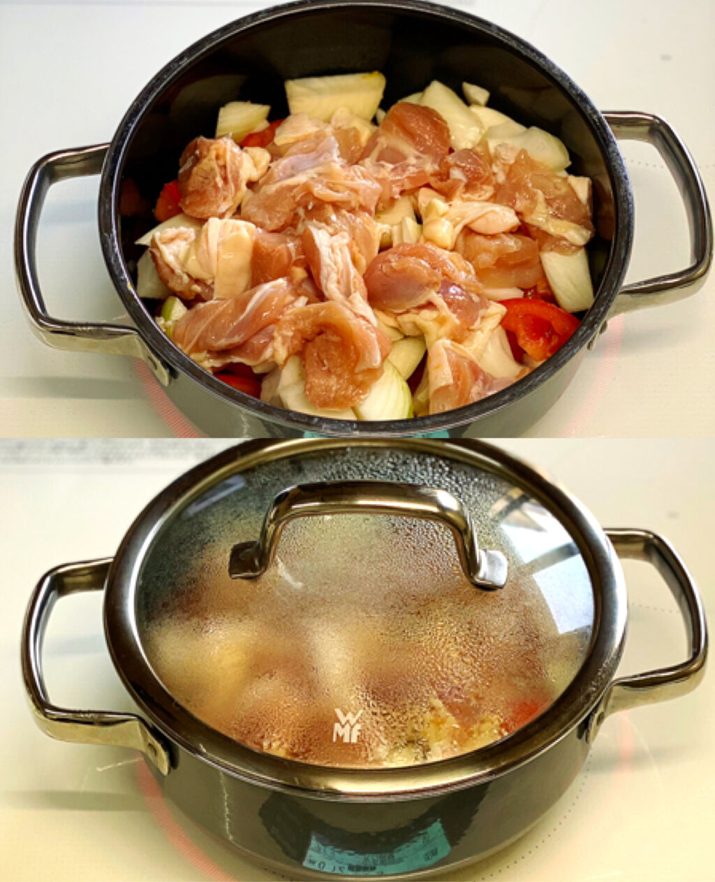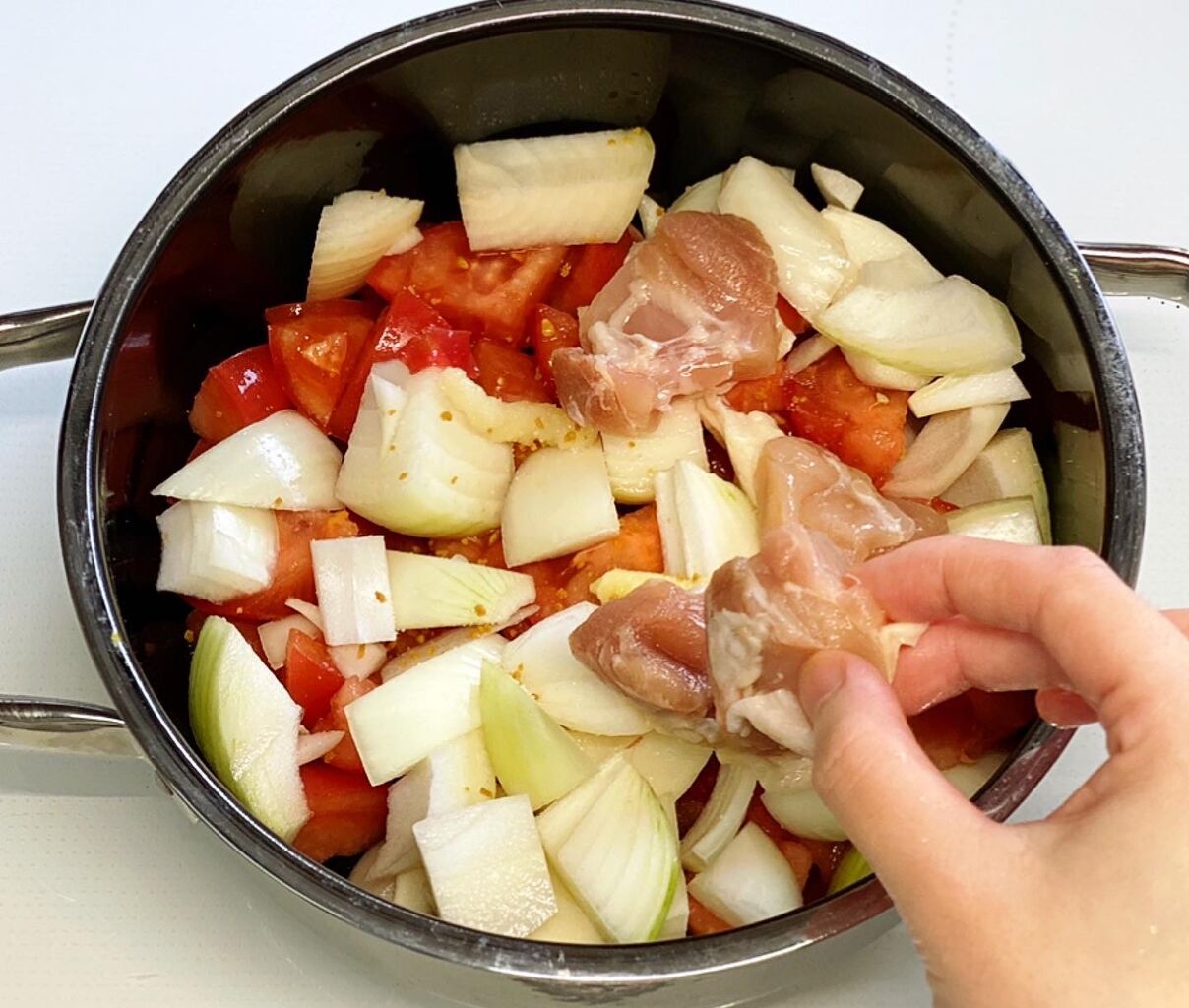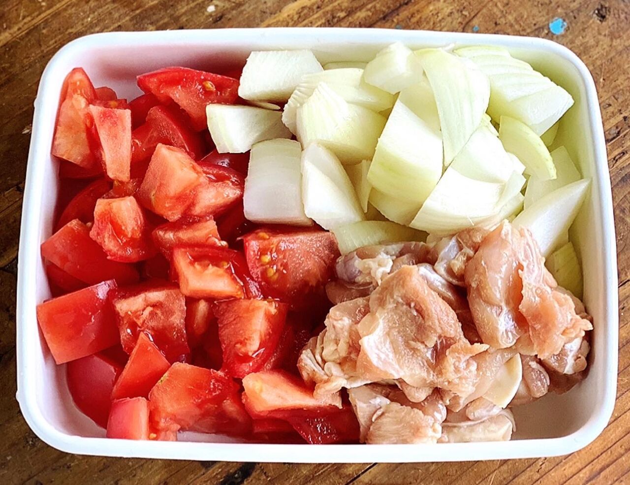 1.鶏肉、トマト、玉ねぎは一口大に切る。鍋にトマト、玉ねぎ、●を入れてざっくり混ぜ、鶏肉を広げてのせる。