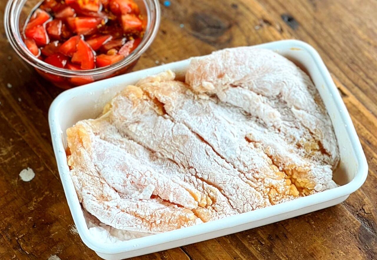 1.トマトは1.5cm大に切って☆と混ぜる(←たれ)。鶏肉は厚みを開いてフォークで刺し、●を揉み込み片栗粉をまぶす。