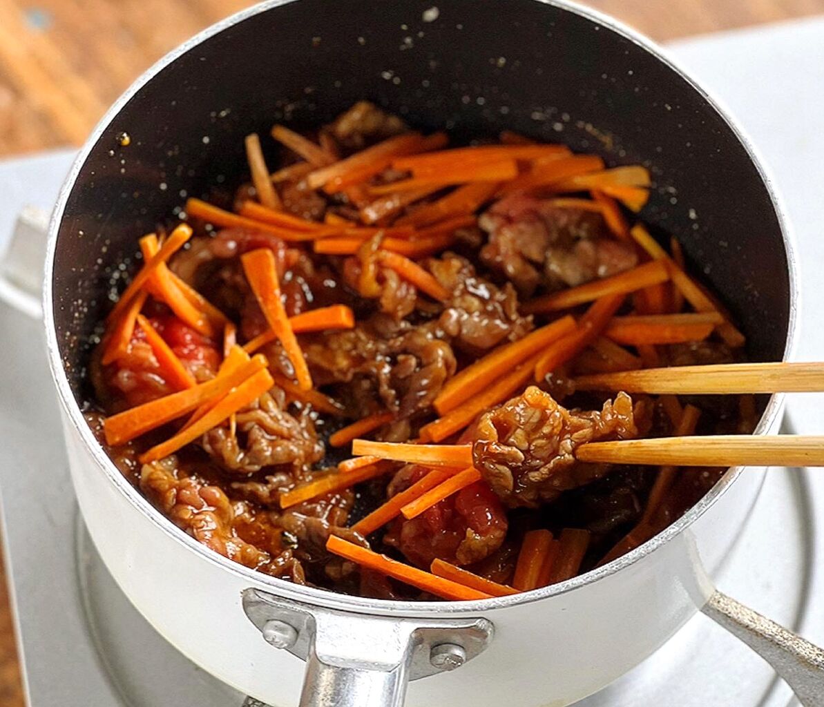 2.鍋に牛肉と●を入れて揉み込む。中火にかけて炒め、火が通ったら人参も加えてさっと炒める。