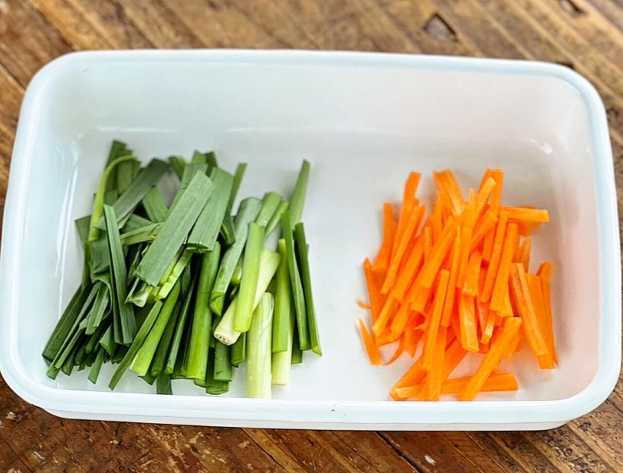 1.ニラは3cm幅に切る。人参は細切りにする。