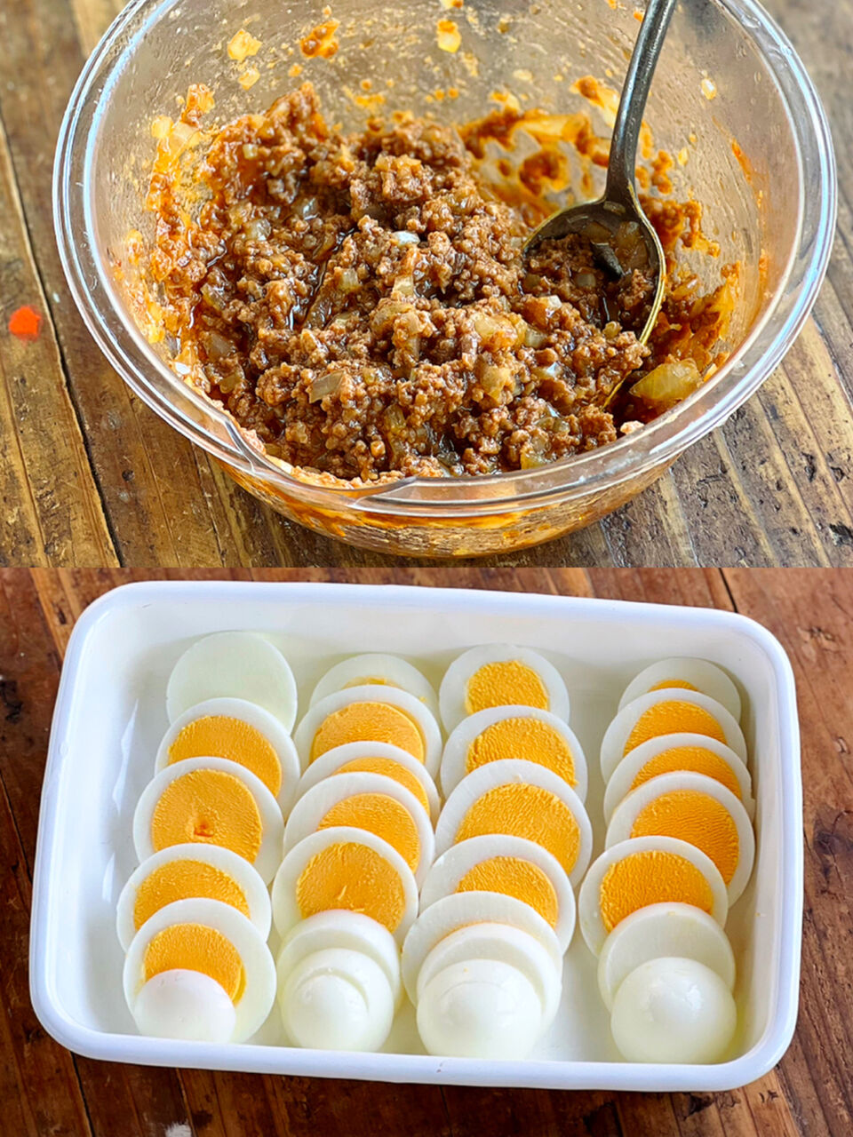 ミートソースとゆで卵を重ね