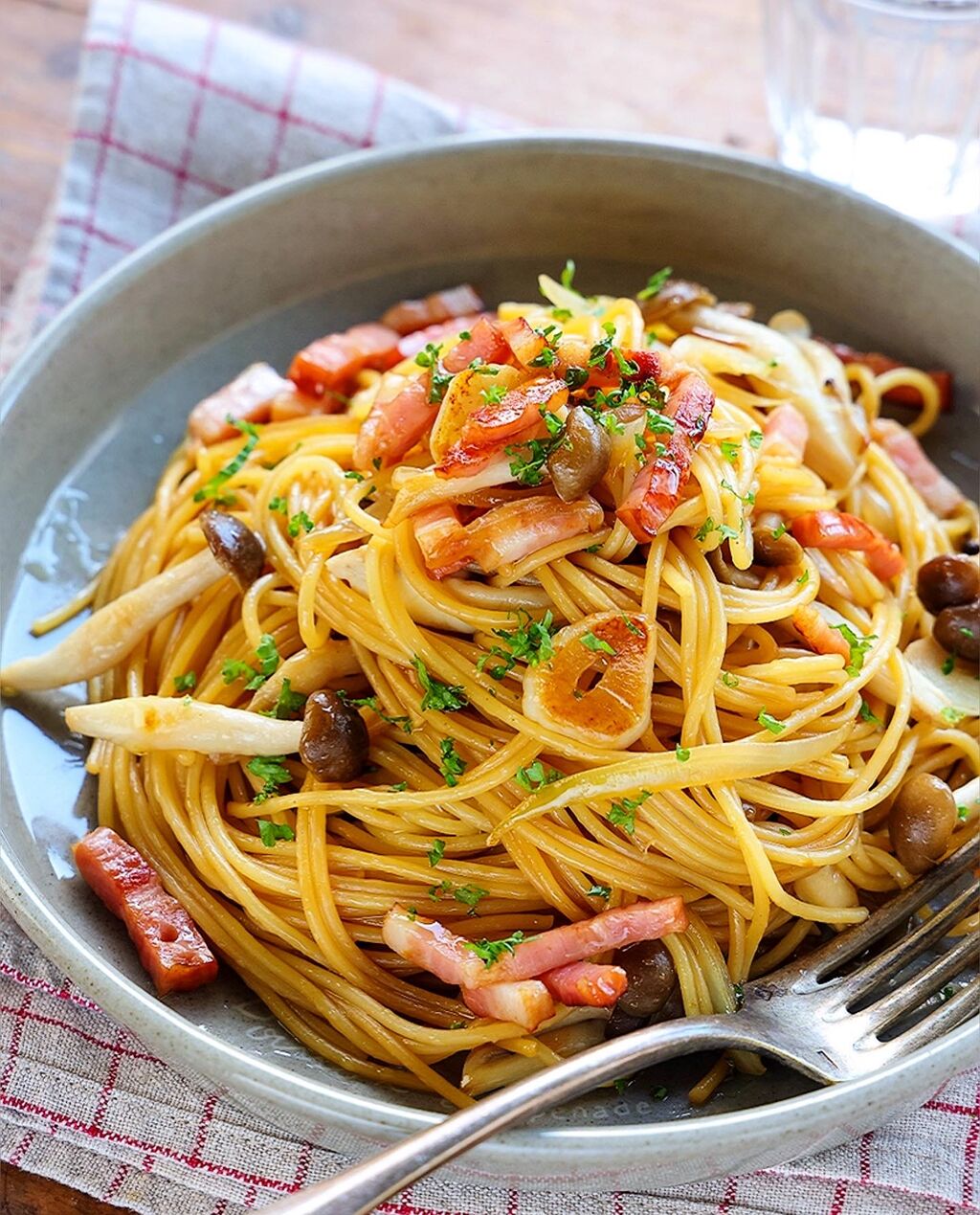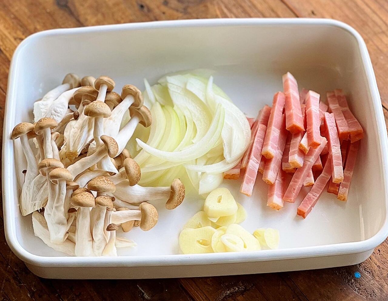 1.ベーコンは5mm角の棒状に切る。玉ねぎとにんにくは薄切りにする。しめじはほぐす。パスタは塩(分量外)を加えた熱湯で表示時間より1分短く茹で、湯を切る。