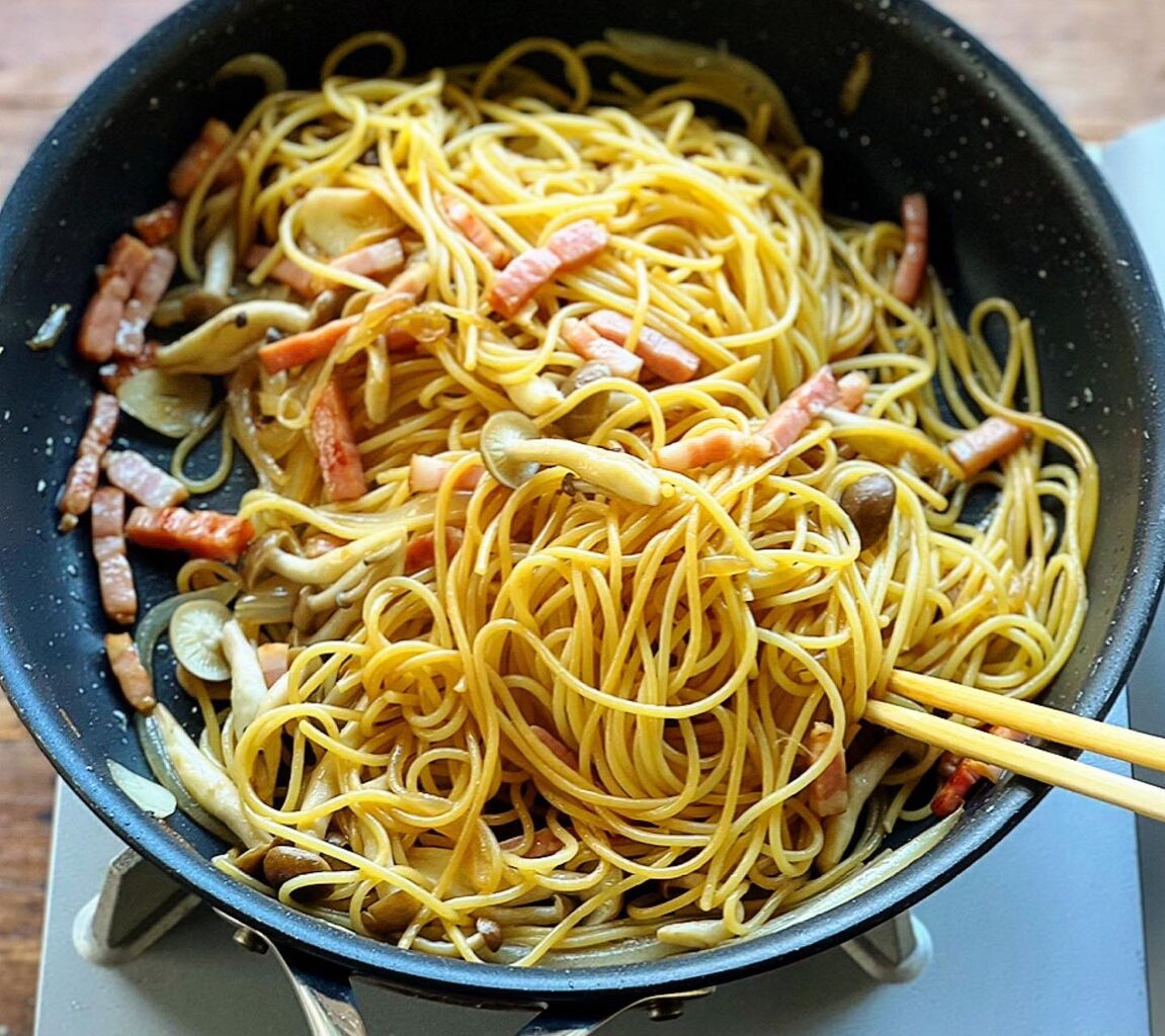 3.しんなりしたらパスタと●を加えてさっとからめ、器に盛り、パセリを振る。