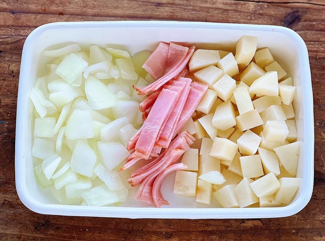 1.じゃがいもと玉ねぎは1cm角に切る。ベーコンは1cm幅に切る。