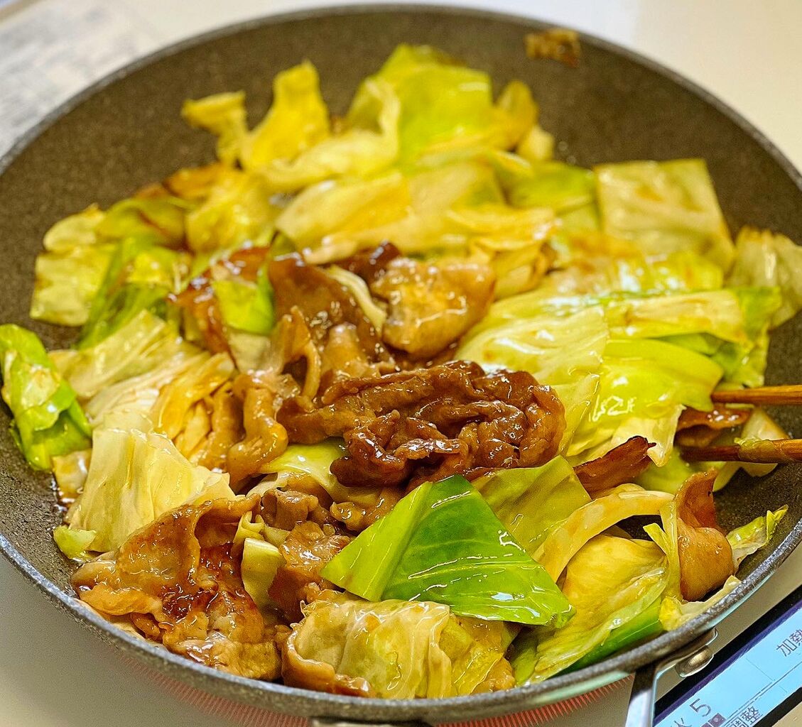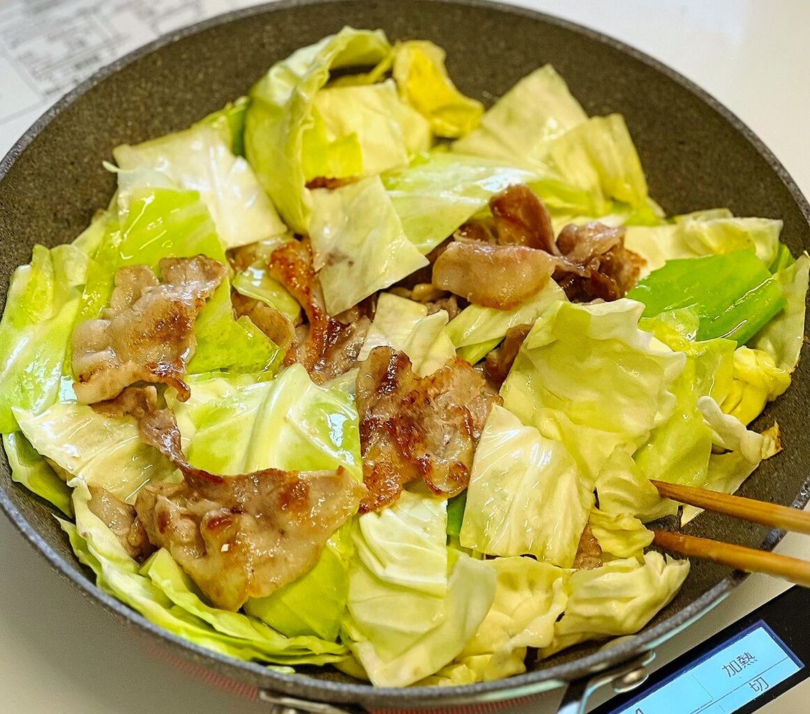 豚肉とキャベツにふわとろ卵を加えて